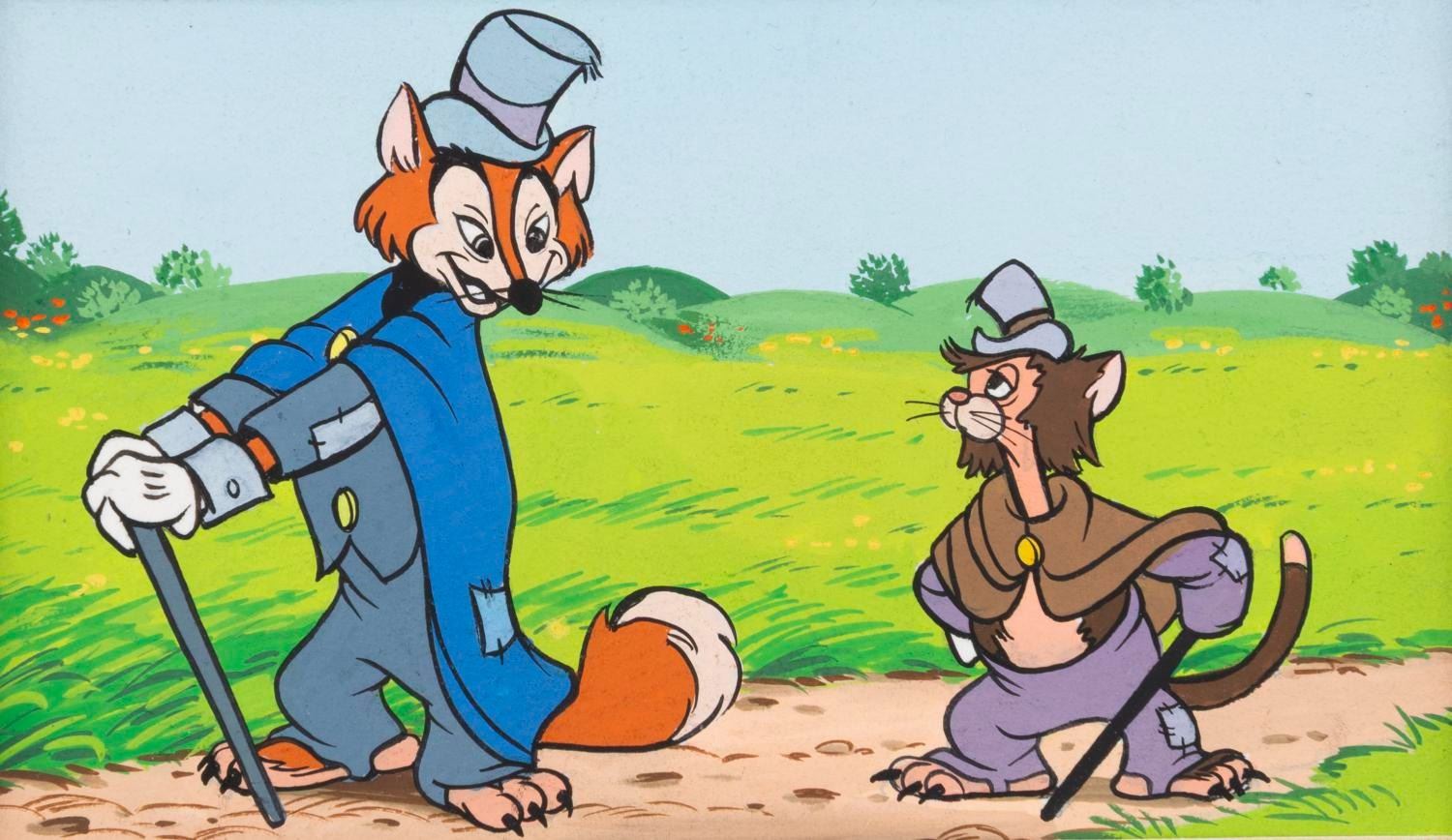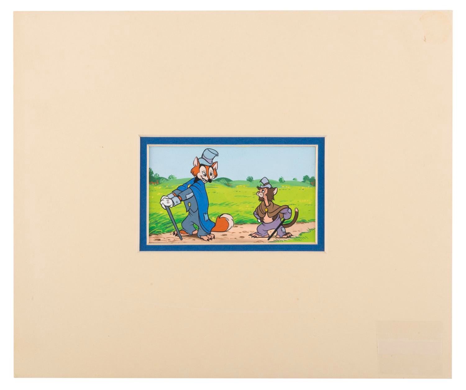(Disney, 1977) An original painting of "Pinocchio " characters Honest John and Gideon, created for the comic book Disney Time #5. Measuring 2.75 " x 3.75 " in an 8.25 " x 9.75 " matte, the art is in fine condition. The matte is in good condition with scratches throughout, tape at the bottom right corner, and soiling at the top right corner, which does not affect the image.