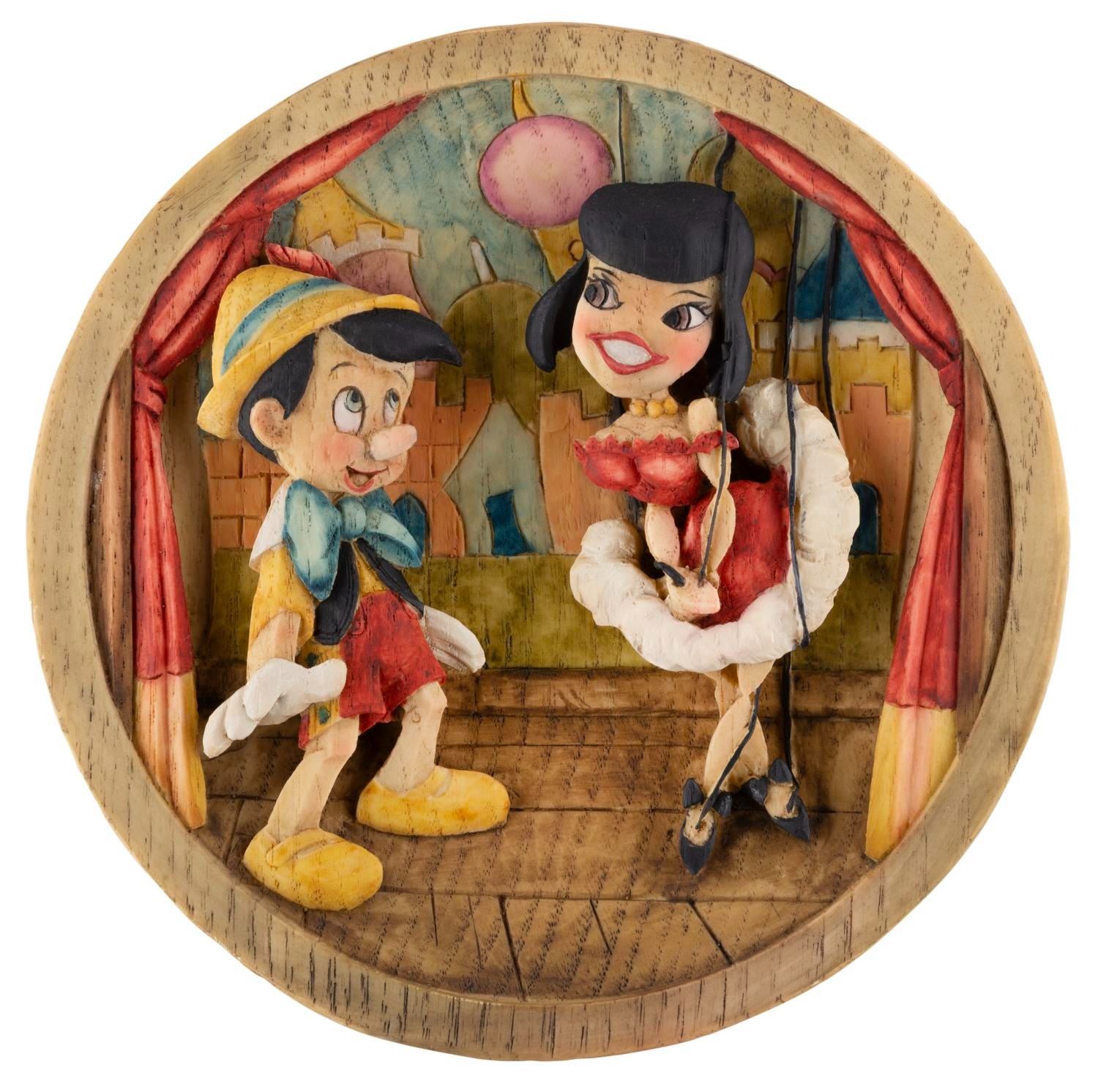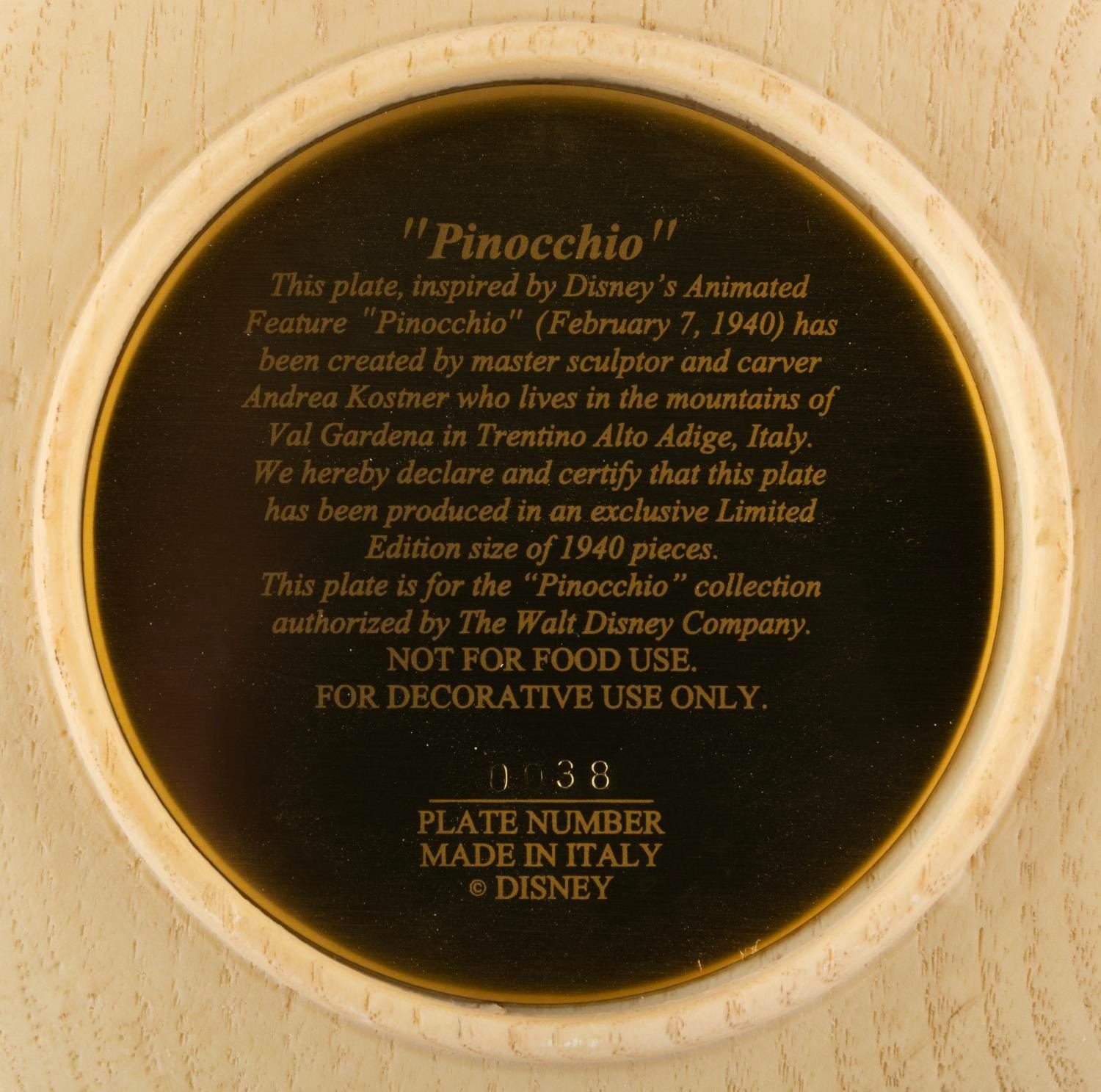 (Disney, 1990s-2000s) A "Pinocchio " decorative plate produced in Italy featuring a relief of Pinocchio and a marionette dancer, released in a limited edition and numbered 0038. Measuring 8.75 " in diameter, the plate is in fine condition with its original box\, which exhibits water damage.
