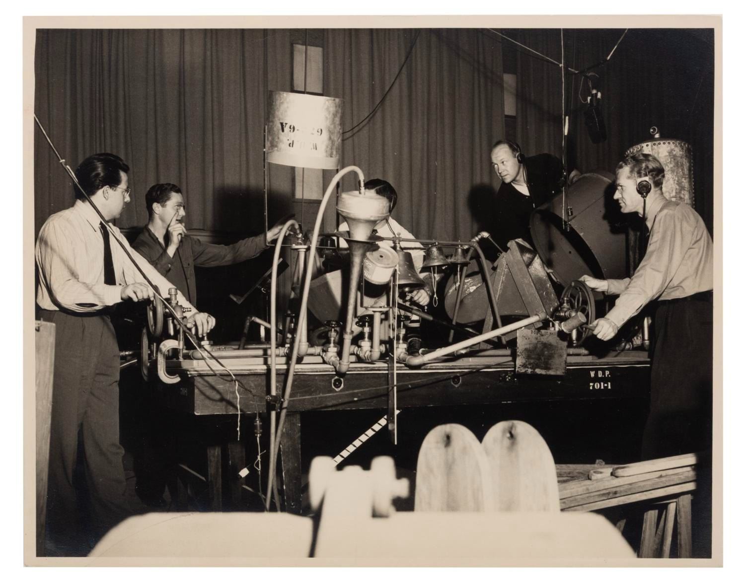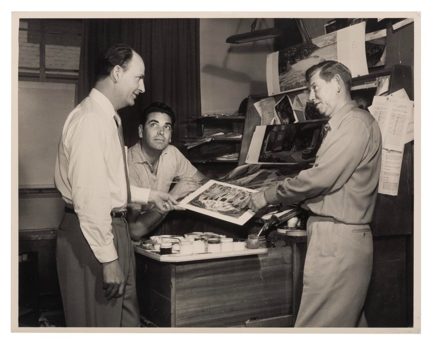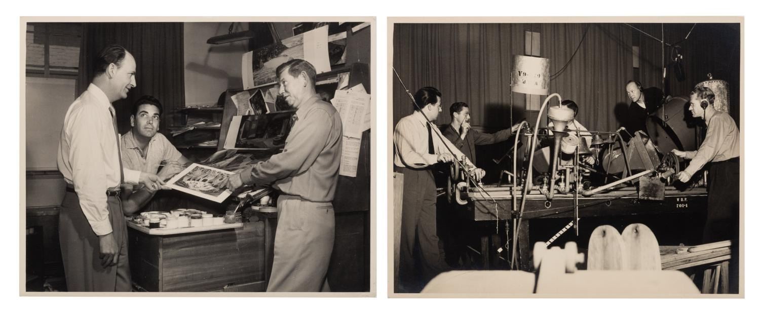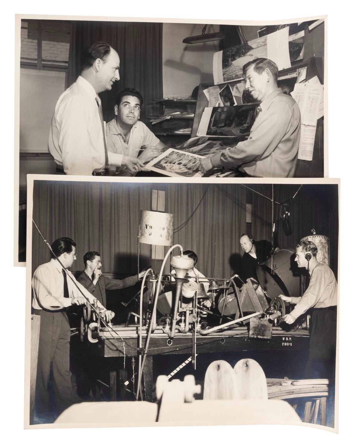 (Disney, 1940/1952) Two oversized behind-the-scenes photos from the Walt Disney Studio. The first, taken in March of 1940, shows a group of men producing foley sound effects, most likely for the Casey Jr. steam engine in "Dumbo. " The second taken October of 1952, shows John Hench, Claude Coats, and Wilfred Jackson with "Alice in Wonderland " concept art. Each measuring 11 " x 14 ", the photos are in very good condition with light handling wear, two creases in the right edge of the "Alice " photo, and toning from age.