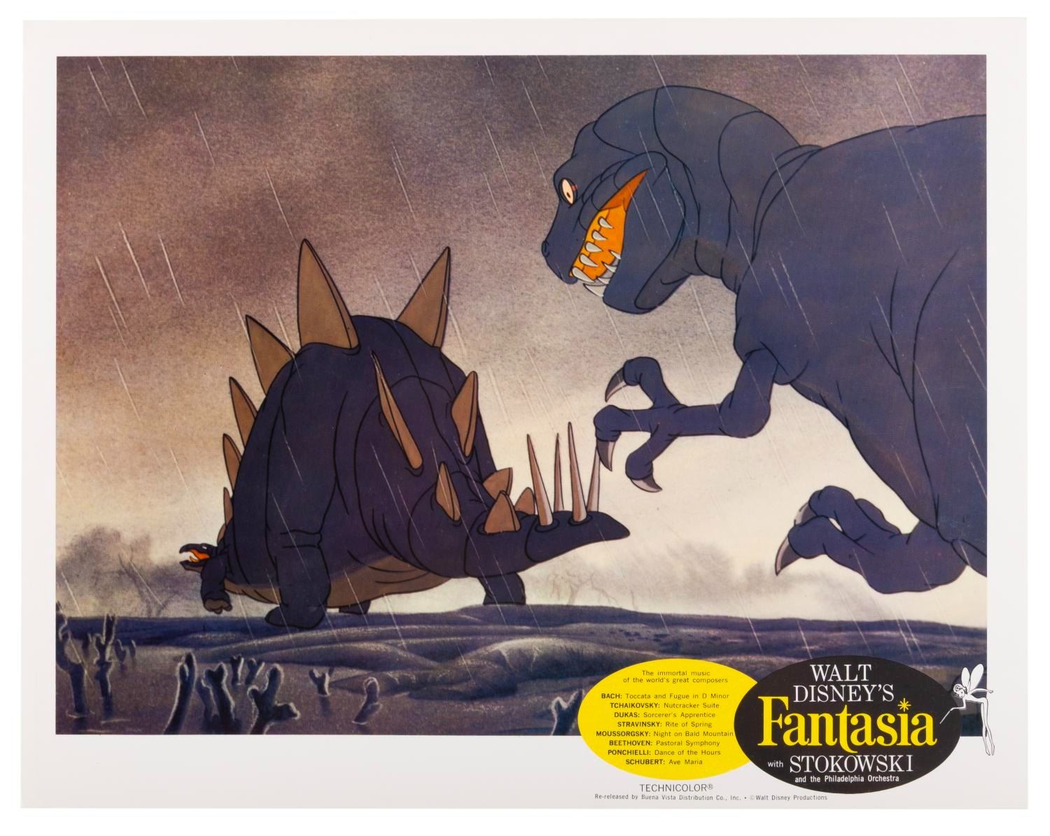 (Disney, 1963) A lobby card from the 1963 re-release of "Fantasia, " featuring a still from The Rite of Spring segment. Measuring 11 " x 14 ", the lobby card is in very good condition with light creases and handling wear.