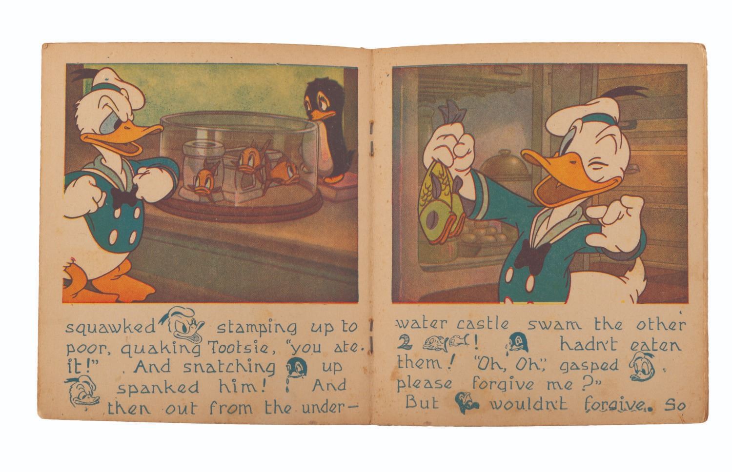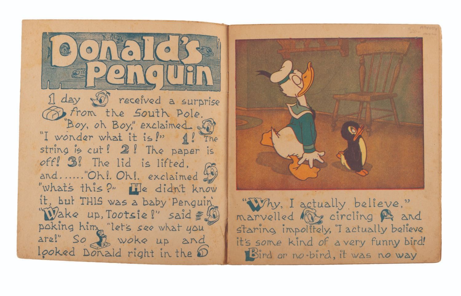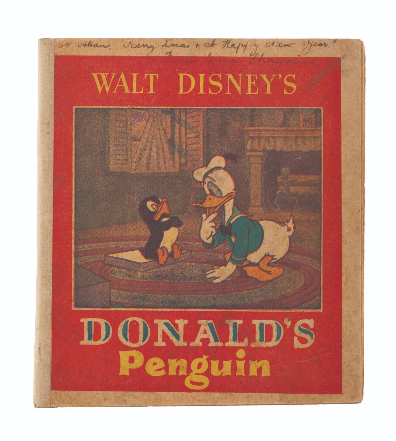 (Shepherd & Martin, 1930-50s) A book recounting the story of the Disney short "Donald's Penguin. " Measuring 6.5 " x 7.5 ", the book displays in good condition with heavy discoloration from age, an inscription on the cover, and wear.