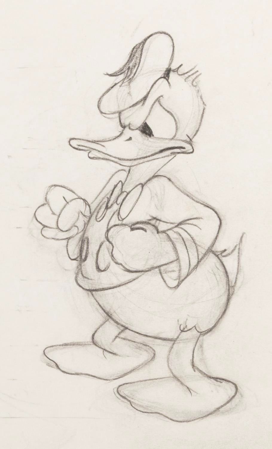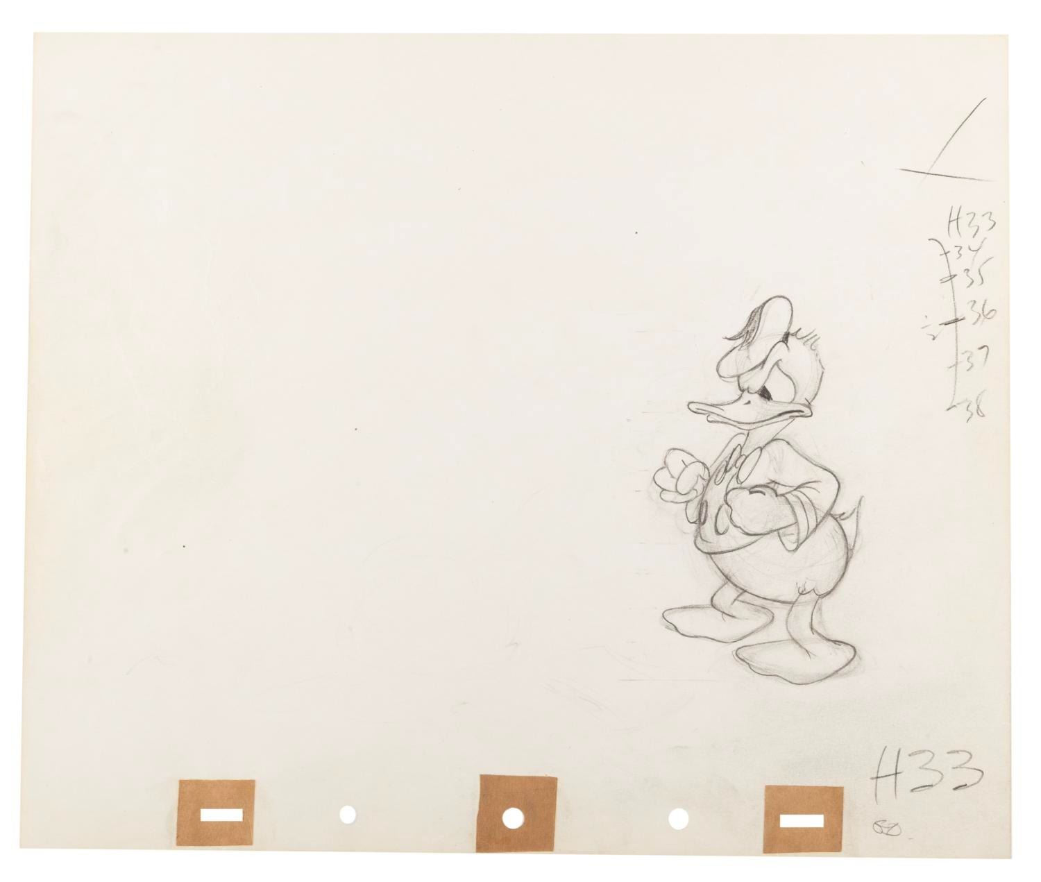 (Disney, 1941) An original production drawing of Donald Duck from "Timber. " Donald has an image size of 2.5 " x 4.75 " on untrimmed 10 " x 12 " animation paper. The graphite drawing is in good condition with creasing, smudging, and discoloration.