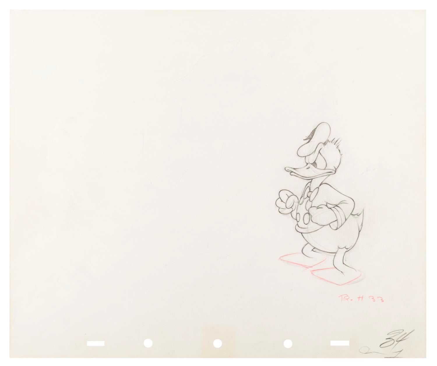 (Disney, 1941) An original production drawing of Donald Duck from the animated short "Timber. " With an image size of 2.75 " x 4.75 " on 10 " x 12 " animation paper, the graphite and colored pencil drawing is in very good condition with creases, smudges, and light wear.