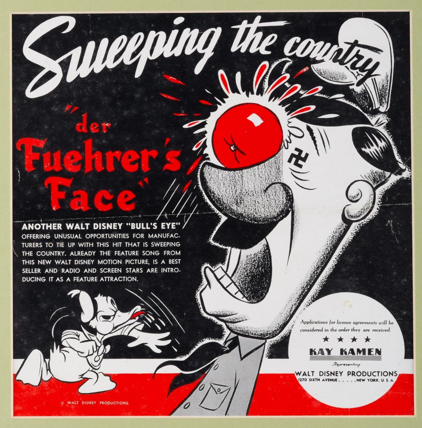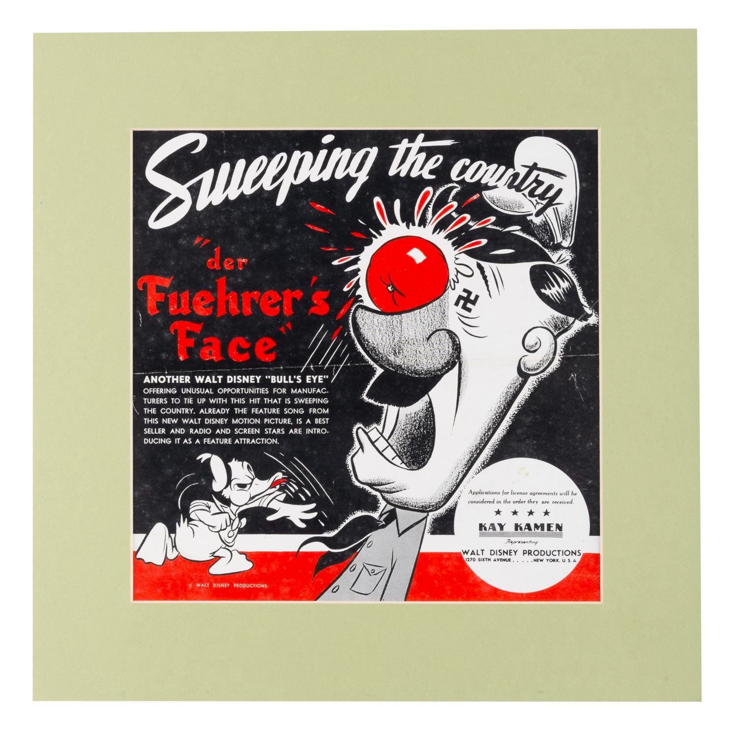 (Disney, 1943) A print ad for the World War II animated short "Der Fuehrer's Face " starring Donald Duck. The lower right corner of the ad mentions Kay Kamen, the legendary licensor who helped shape Disney into the merchandising force it is today. Measuring 10 " x 10 " in a 13.25 " x 13.25 " matte, the ad is in good condition with a fold, creases, scratches, and wear.