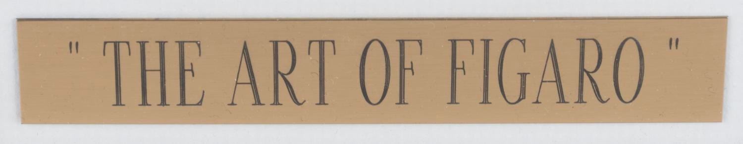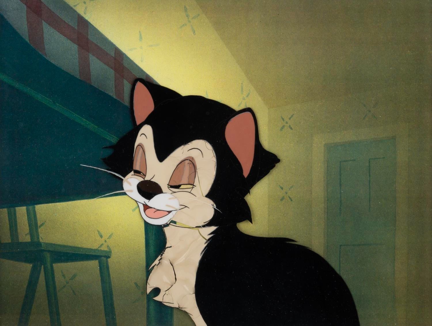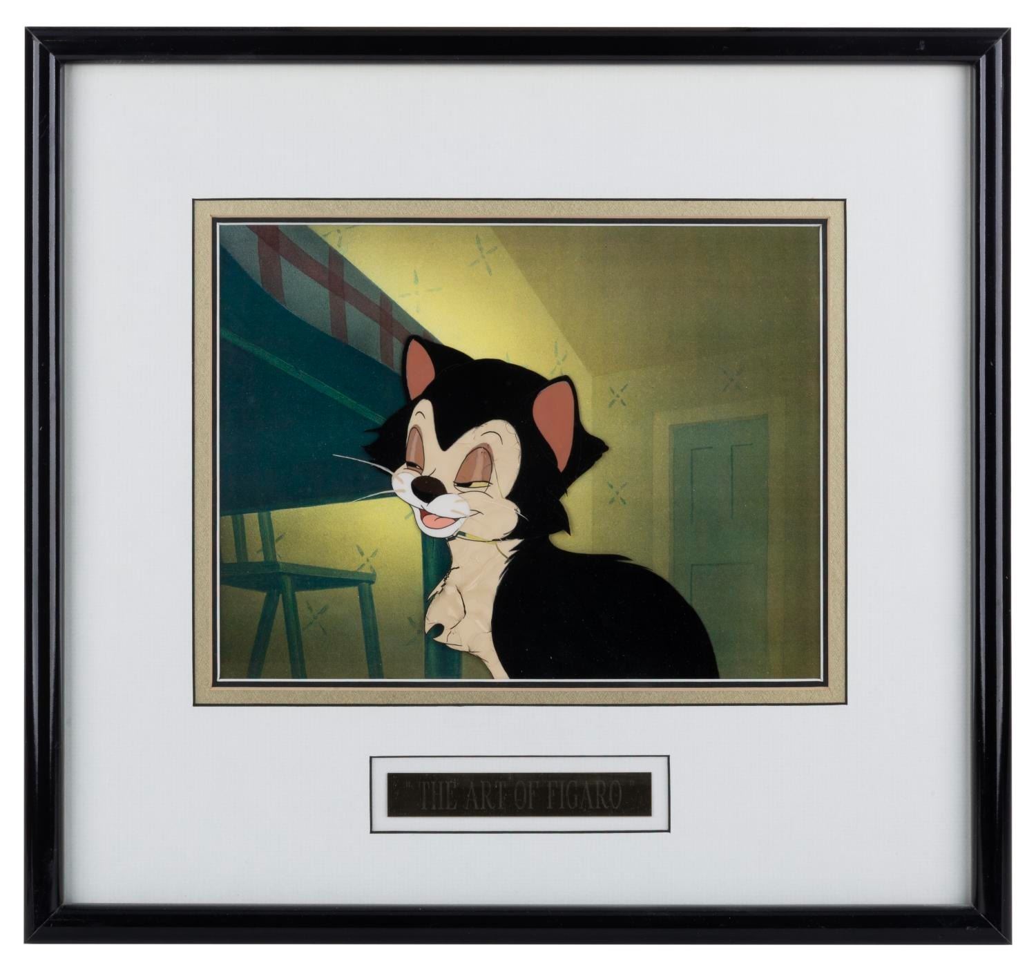 (Disney, 1943) An original production cel of Figaro from "Figaro & Cleo, " framed with a color copy background. Figaro measures 6 " x 6.5 " on a 7.5 " x 10 " visible cel in a 15.5 " x 16.75 " frame. The cel is in fair condition with heavy paint cracking and loss.