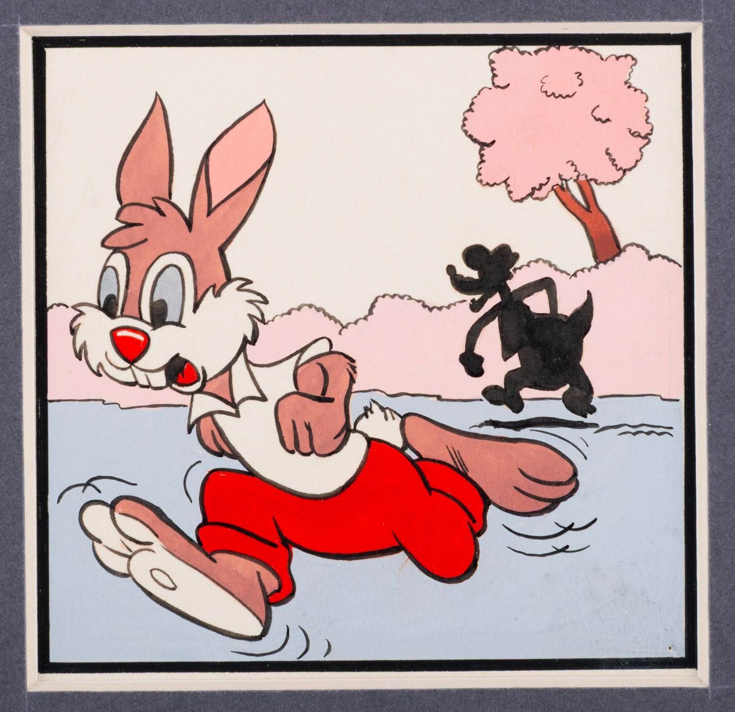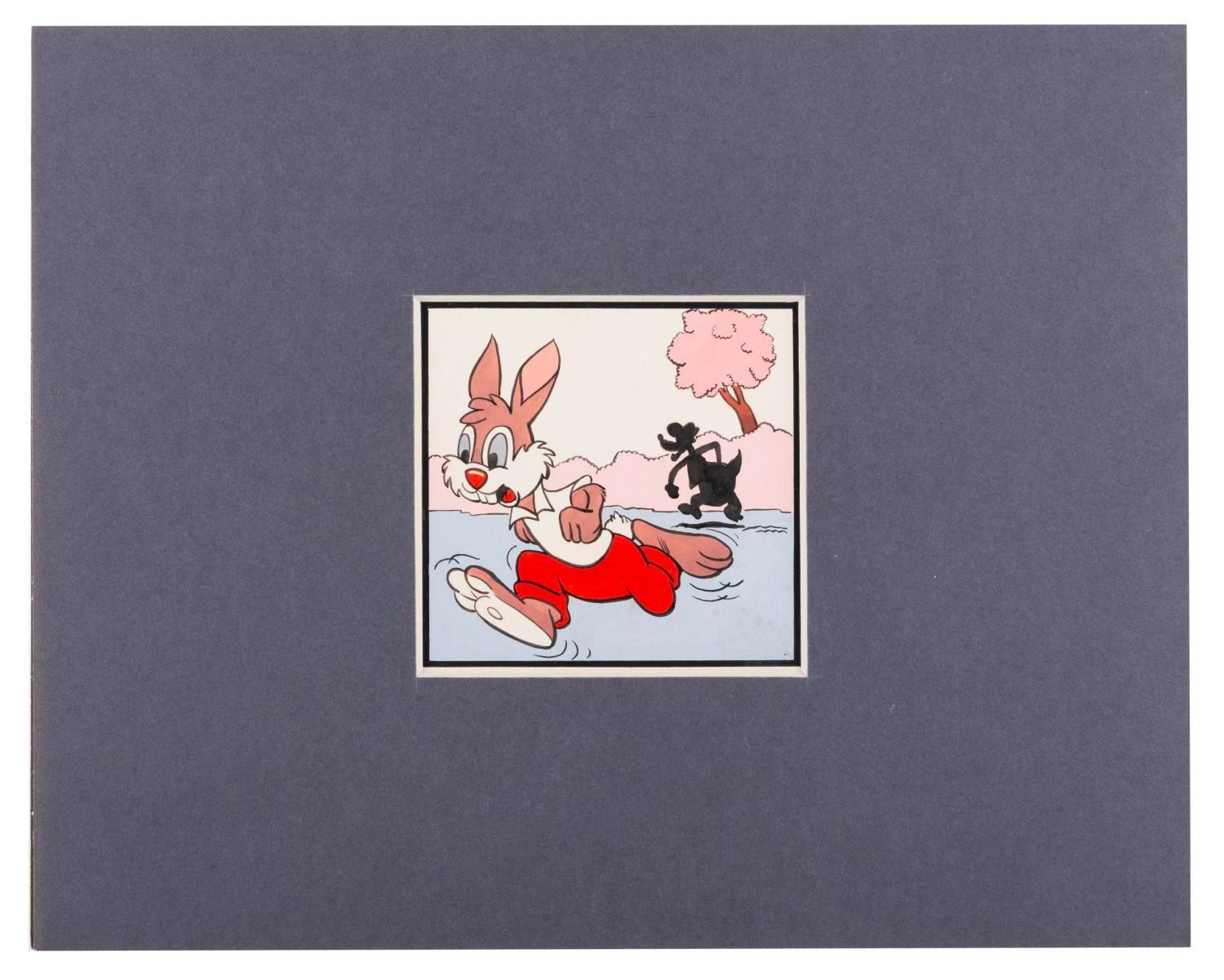 (Disney, 1970s-80s) An original painting of Br'er Rabbit and Br'er Fox from "Song of the South " created for a book or magazine. Measuring 3.25 " x 3.25 " and 8 " x 10 " matted, the painting is in very good condition with light wear from production, including soiling and discoloration.