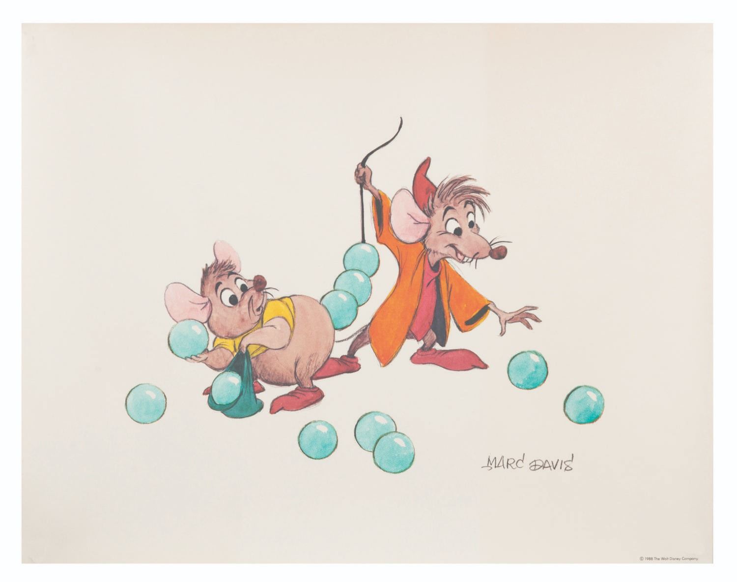 (Disney, 1988) A concept artwork lithograph by Disney Legend Marc Davis, featuring Jaq and Gus, released in conjunction with the 1988 home video release of "Cinderella. " With a character image size of 9.75 " x 7.25 " on 11 " x 14 " cardstock, the print is in good condition with light discoloration from age and a small tear in the upper left corner.