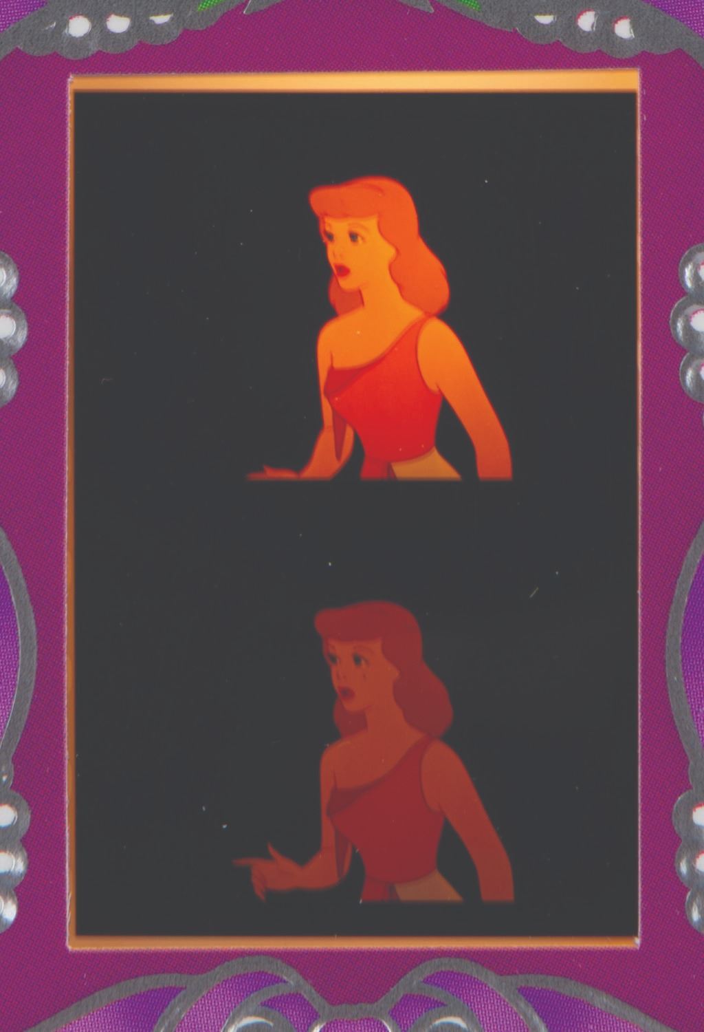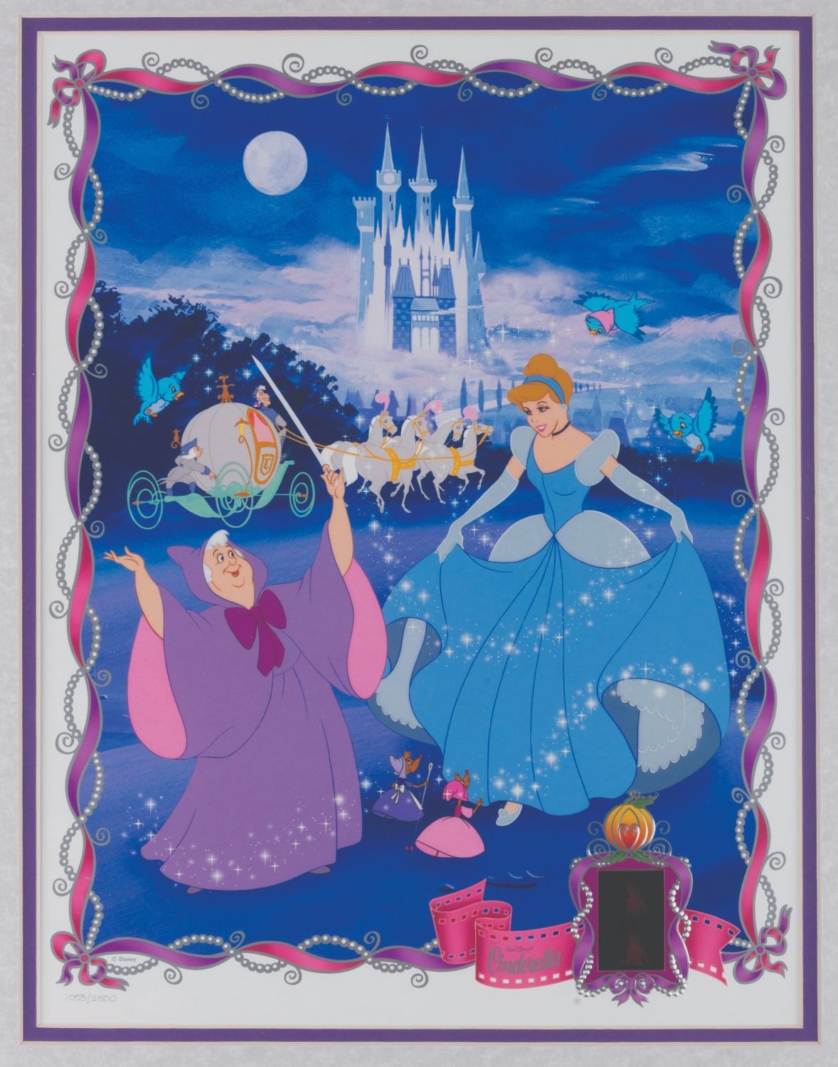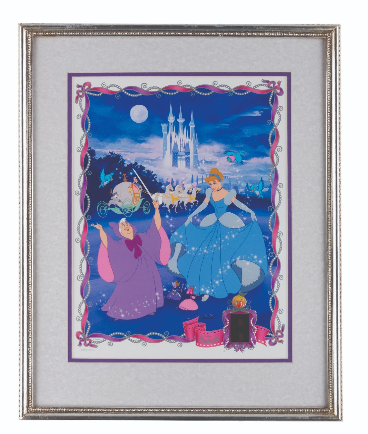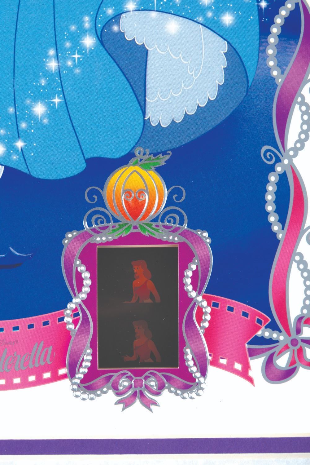 (Disney, 1998) A "Cinderella " lithograph with an inset 35mm film cel. With a 9-volt battery (not included), the film lights up. This print was released in a worldwide edition of 2,500. Measuring 17.5 " x 21.5 " in total, the framed lithograph is in fine working condition.