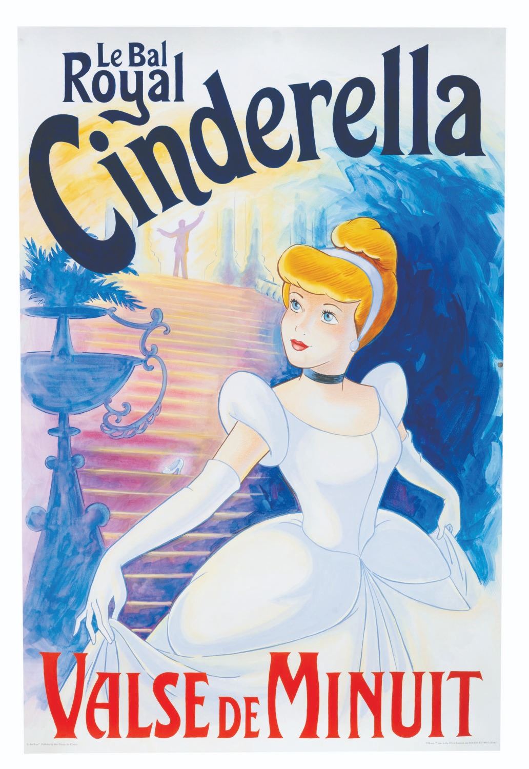 (Disney Art Classics, 1990s) A "Le Bal Royal Cinderella " poster featuring Cinderella running from the Royal Ball. Measuring 24 " x 36 " the poster is in fine condition with slight smudging on the reverse.