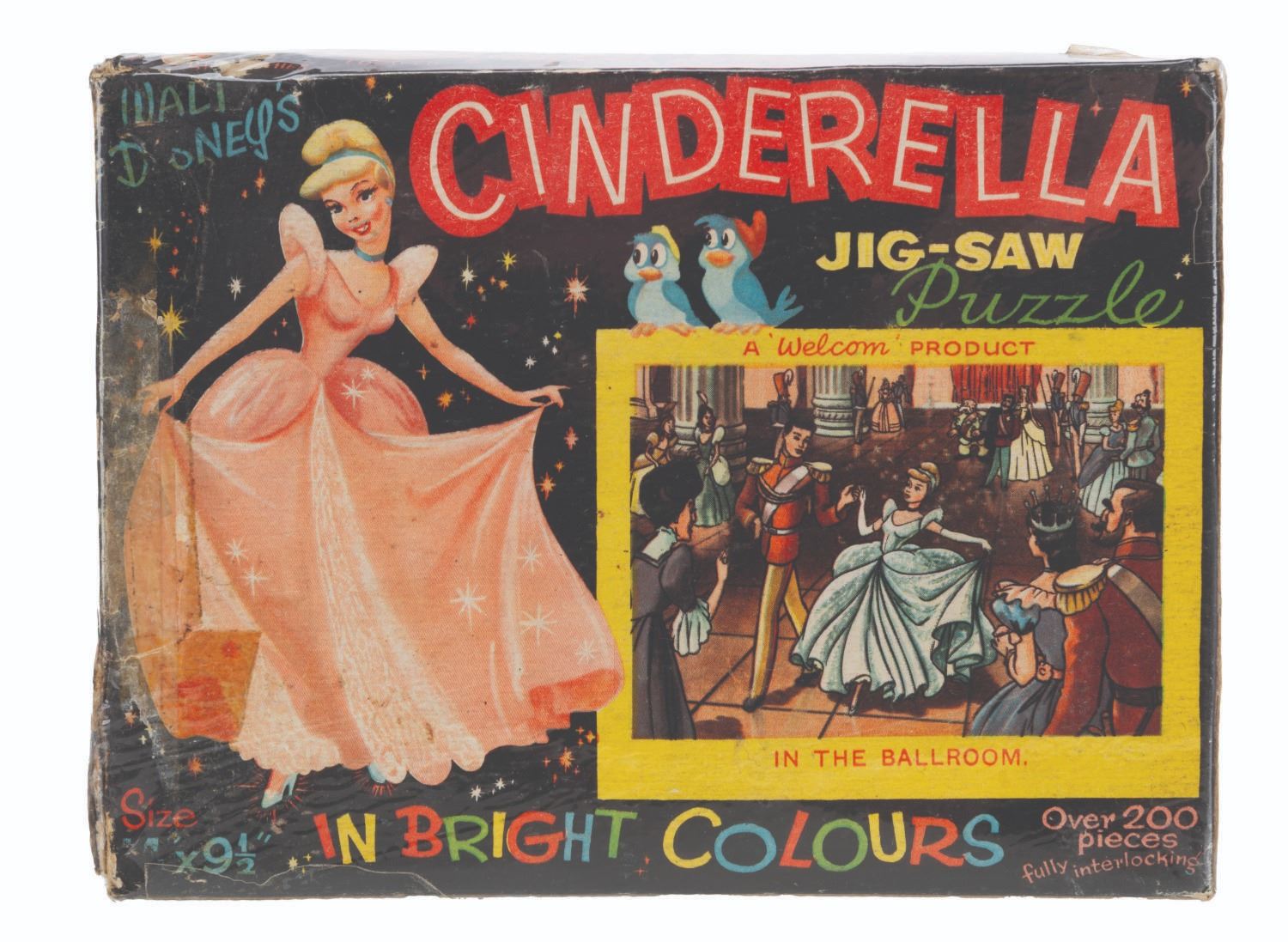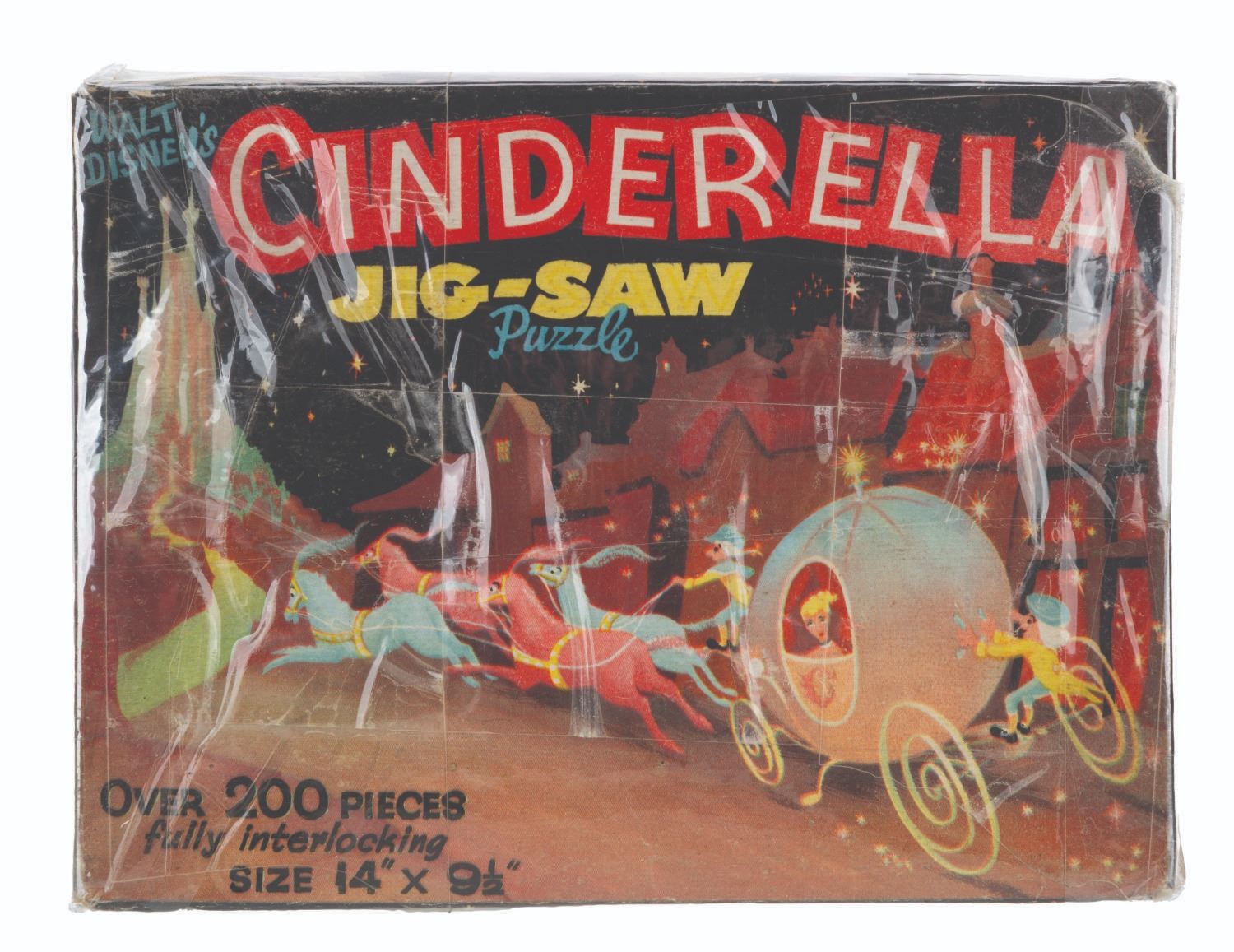 (Williams Ellis & Co. Ltd., 1950s) An empty "Cinderella " jigsaw puzzle box with illustrations of the film's characters on all sides. Measuring 6.75 " x 1.5 " x 5 ", the empty puzzle box is in good condition with adhesive residue, tears, minor stains, discoloration from age, and wear.