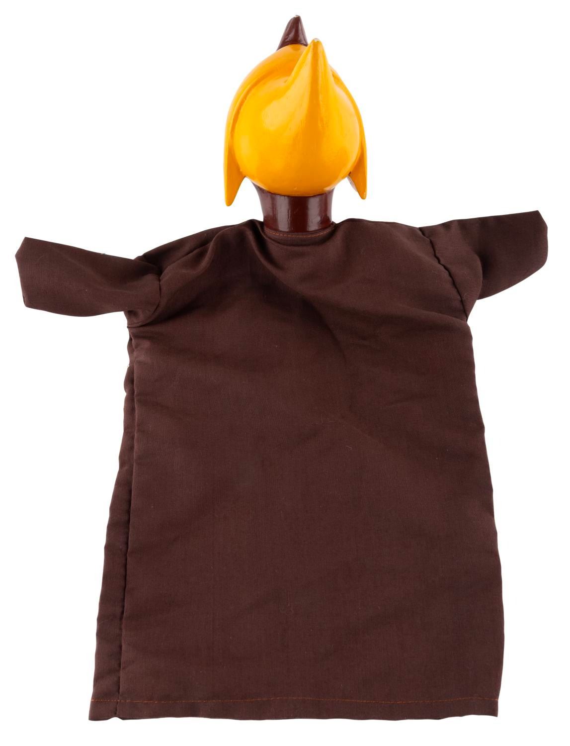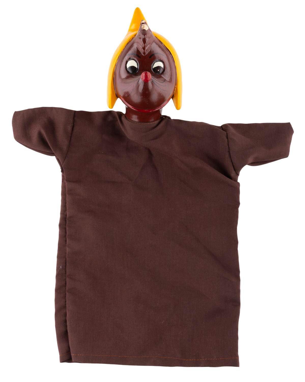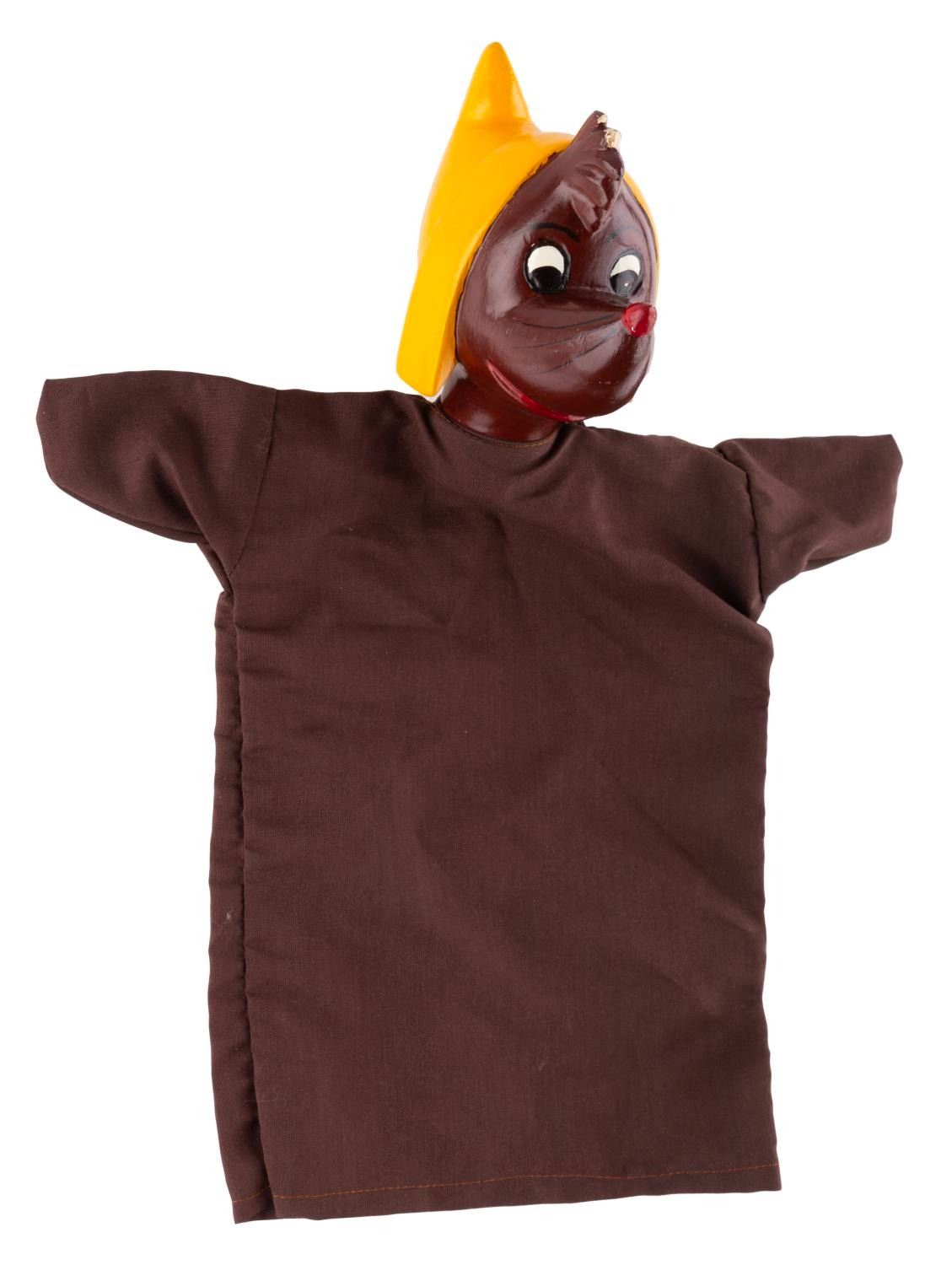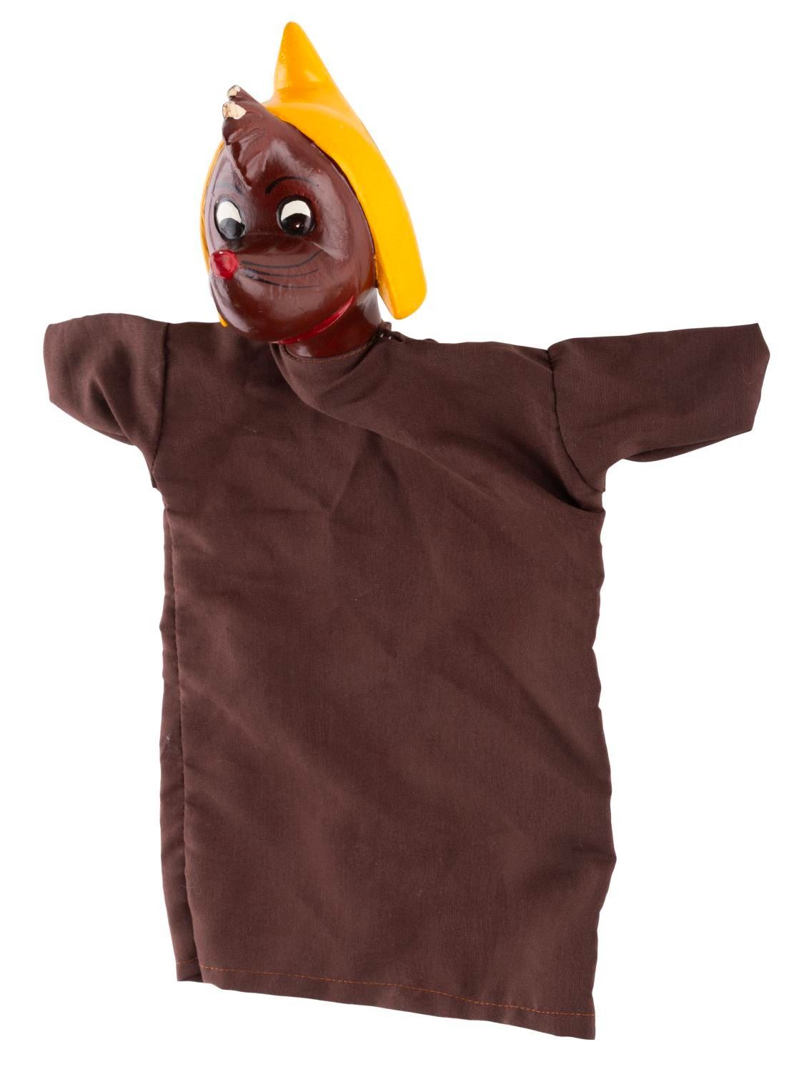 (Disney, 1950s-70s) A hand puppet of Suzy or another girl mouse from "Cinderella. " The puppet has a composition head, and a brown fabric body that may be a newer replacement. The puppet is in good condition with spots of wear at the top of the hair.