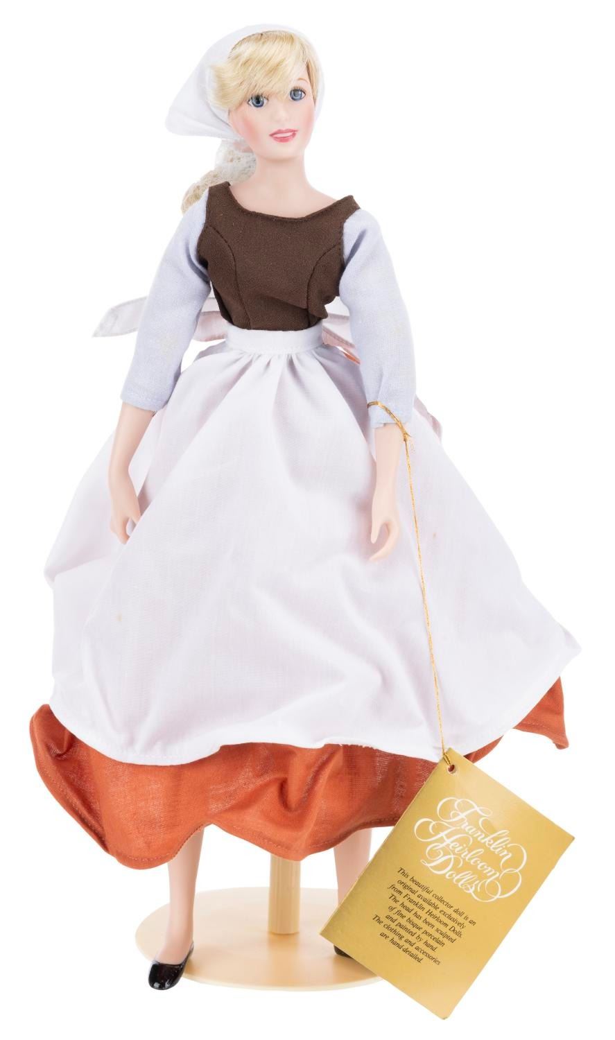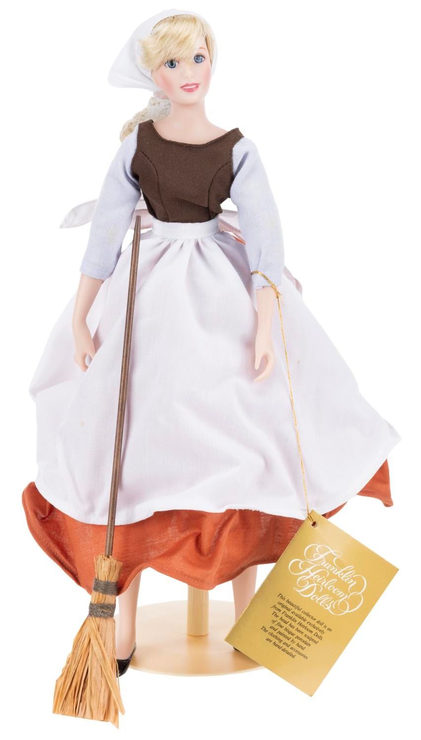 (Franklin Heirloom Dolls, 1980s-1990s) A hand painted porcelain Cinderella in Rags doll by Franklin Heirloom Dolls. Measuring 15 " tall, the doll is in fine condition, while her original box exhibits minimal wear from handling and storage.