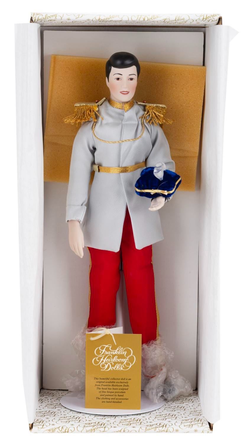 (Franklin Heirloom Dolls, 1980s-90s) A hand-painted porcelain Prince Charming doll with fabric clothing and a display stand. Measuring 15 " tall, the doll is in fine condition in the original box.