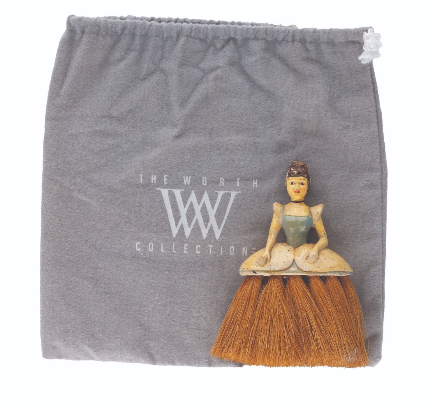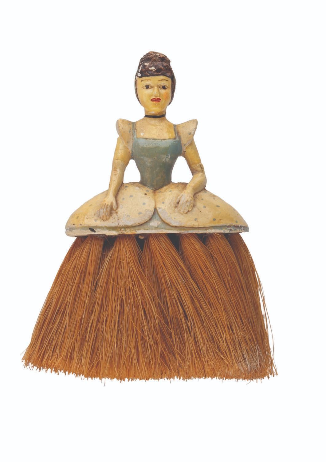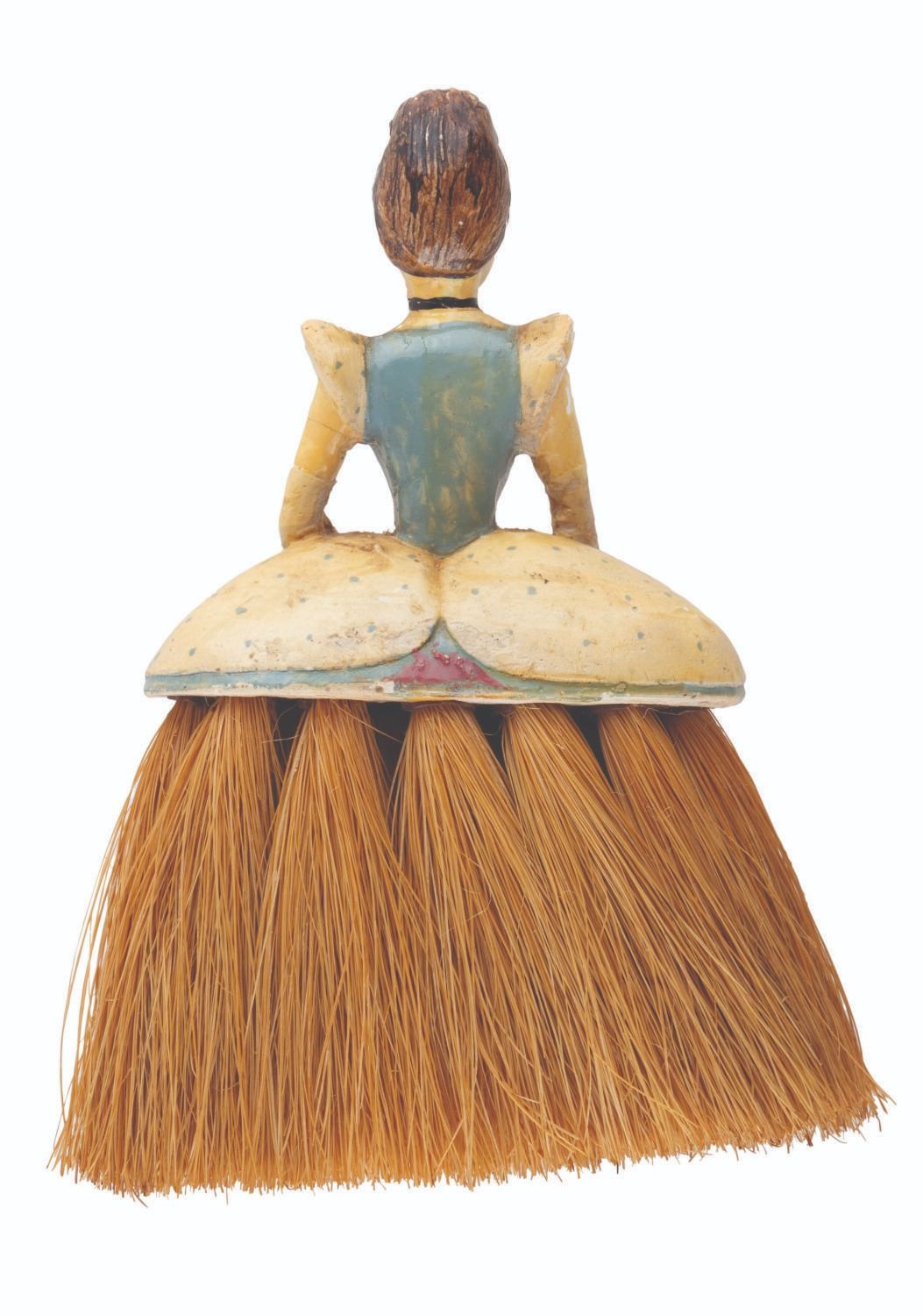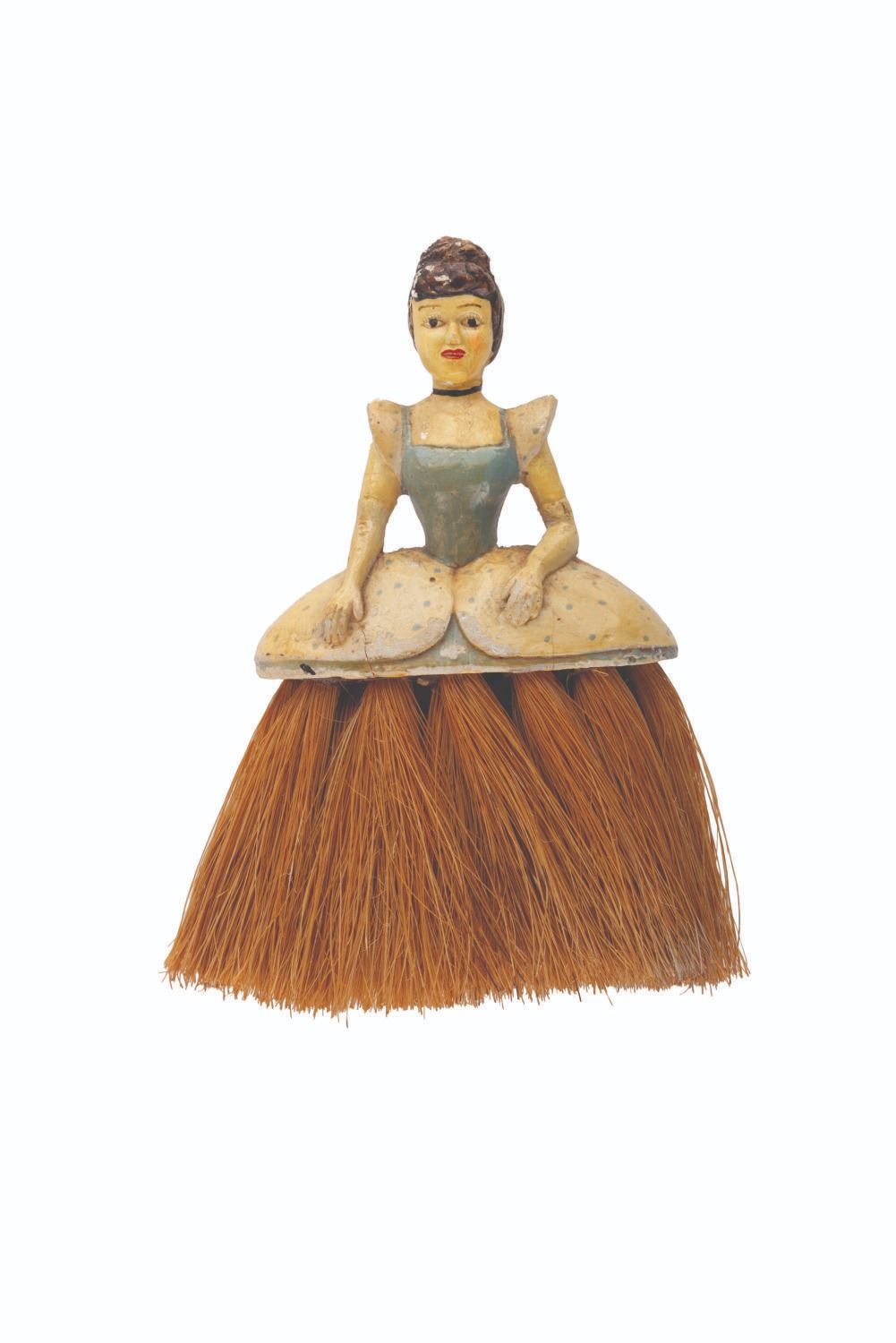 (Disney, 1950s) An unusual Cinderella novelty brush, with a painted body and broom-like bristles forming the dress. Measuring 4.5 " x 5.5 " x 1.5 ", the brush is in good condition, with wear from use, some small chipping to the surface, and discoloration from age.