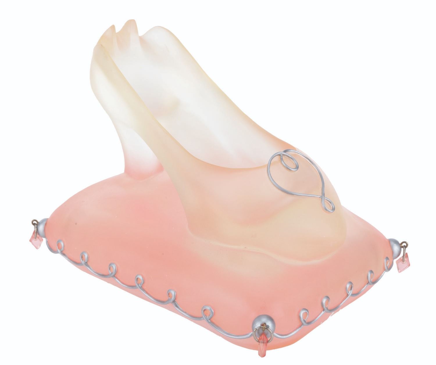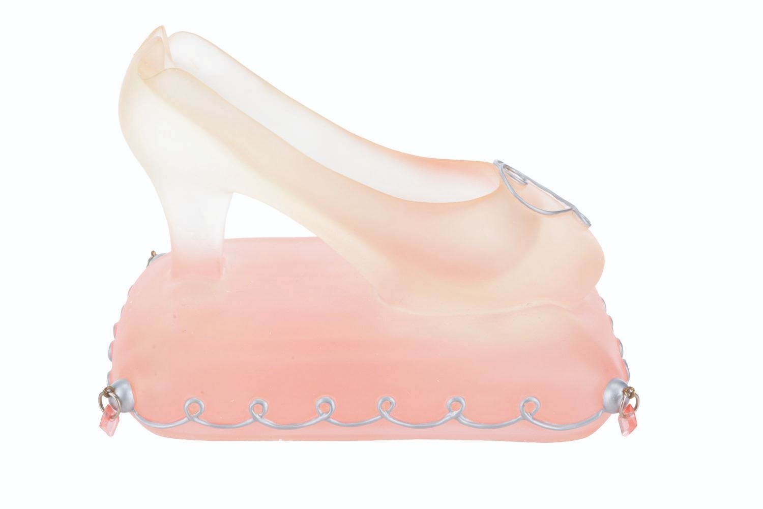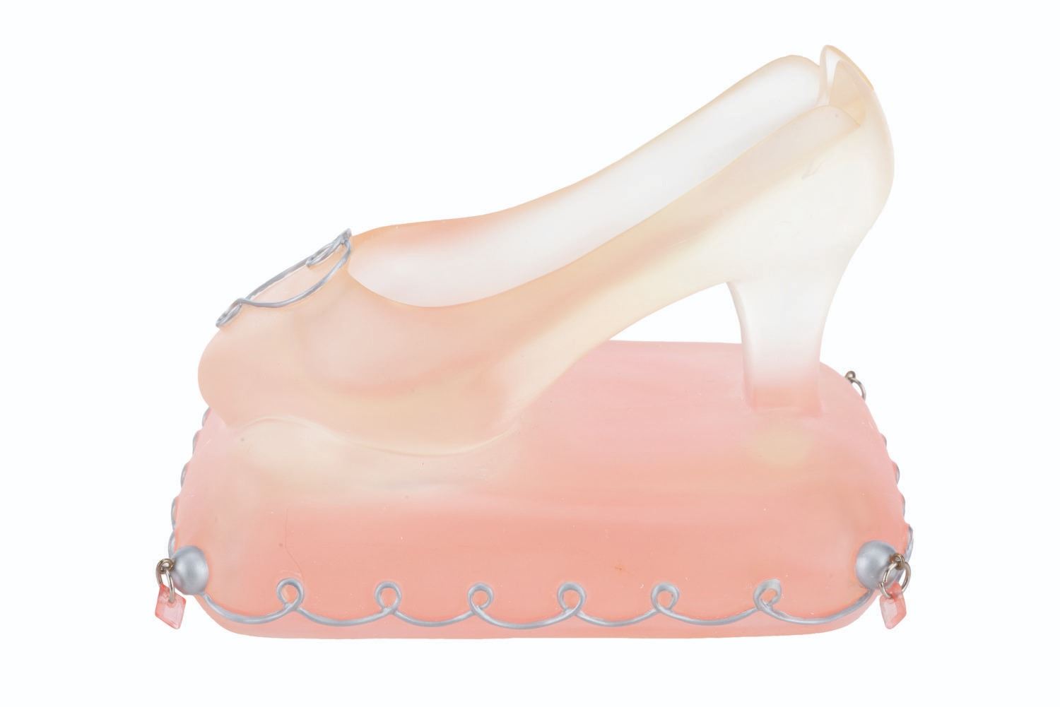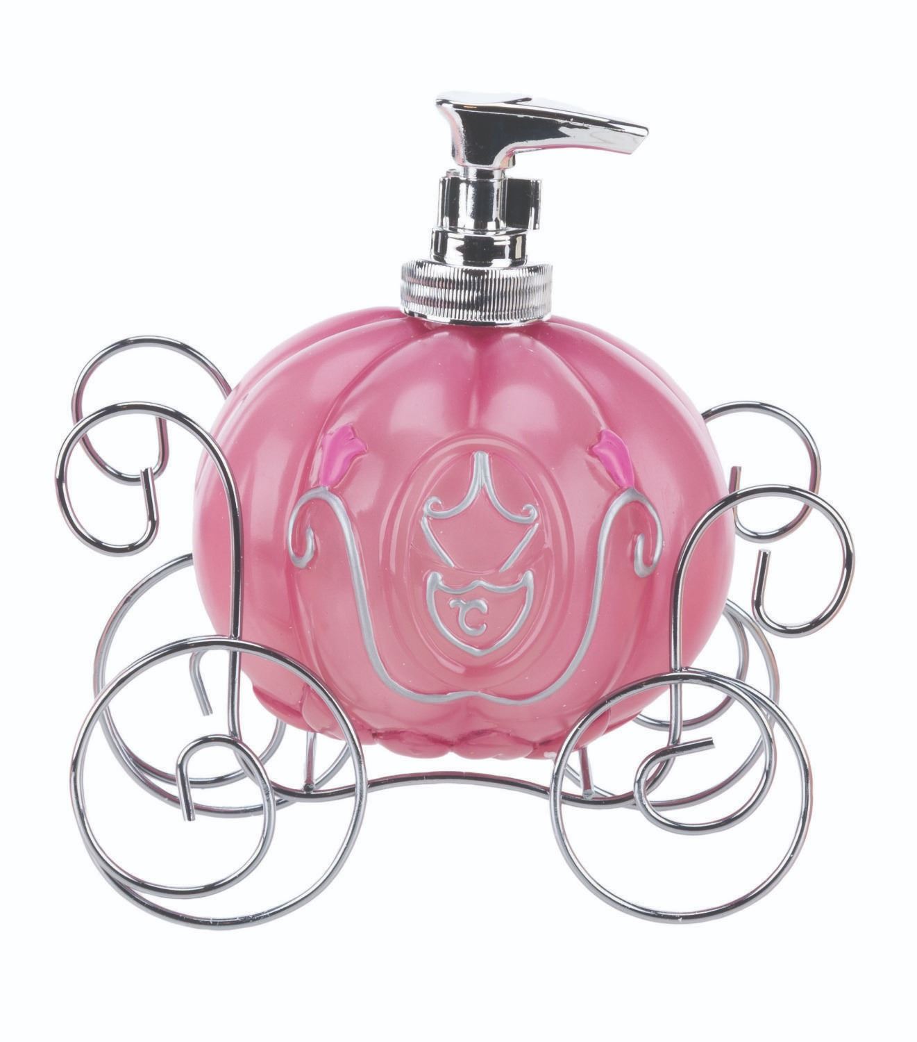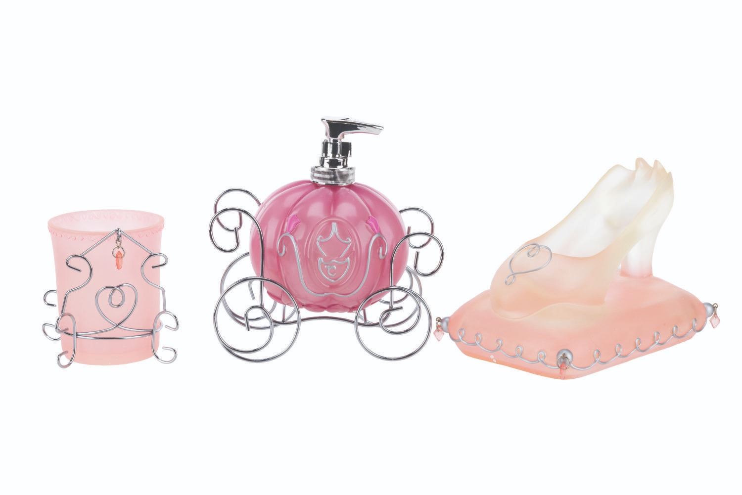 (Disney, 2000s) A trio of "Cinderella " bathroom accessories including a pumpkin carriage soap dispenser, a glass slipper, and a matching mouthwash cup. The set is in fine as-new condition.