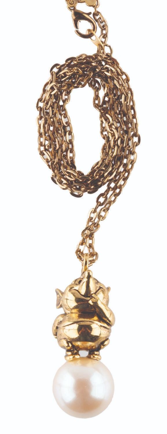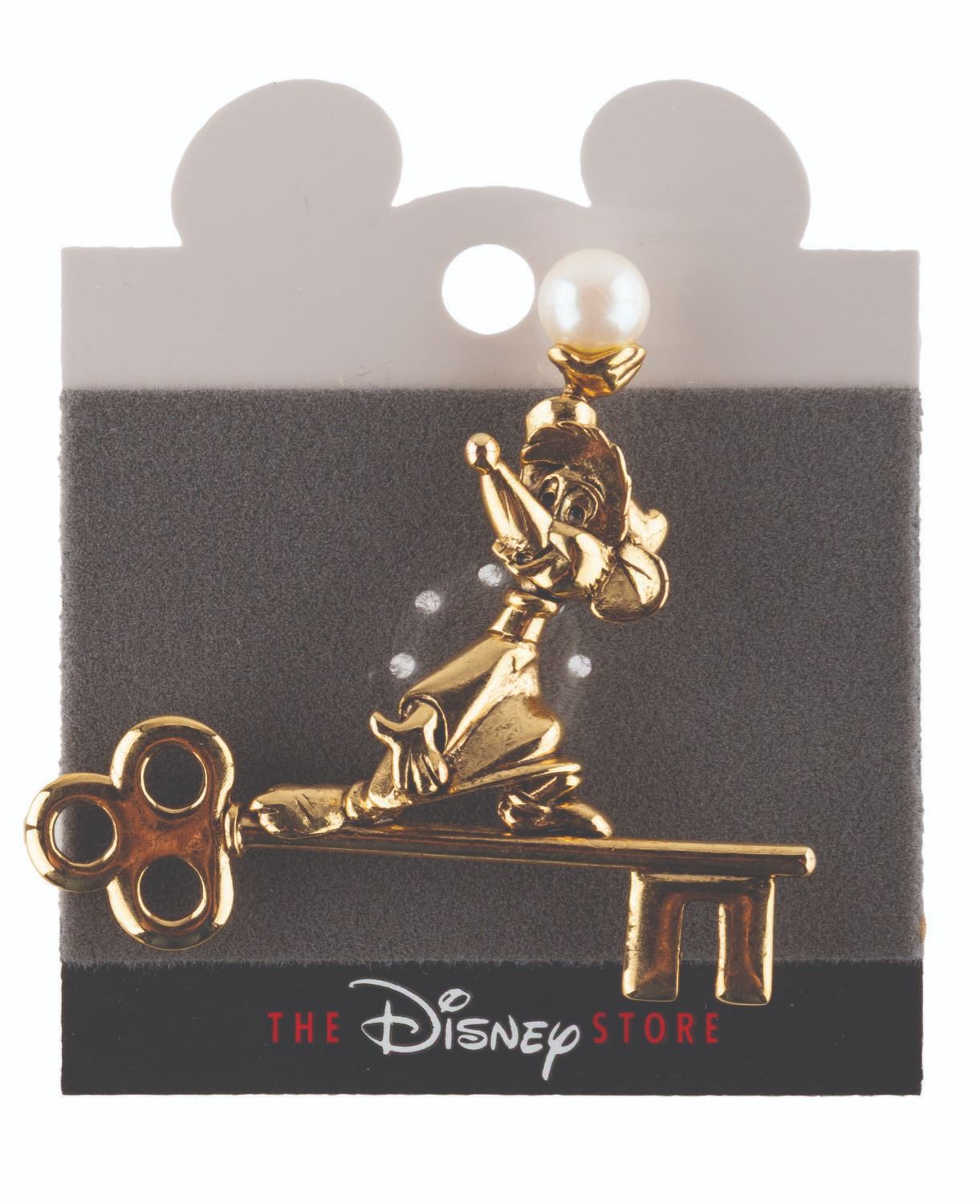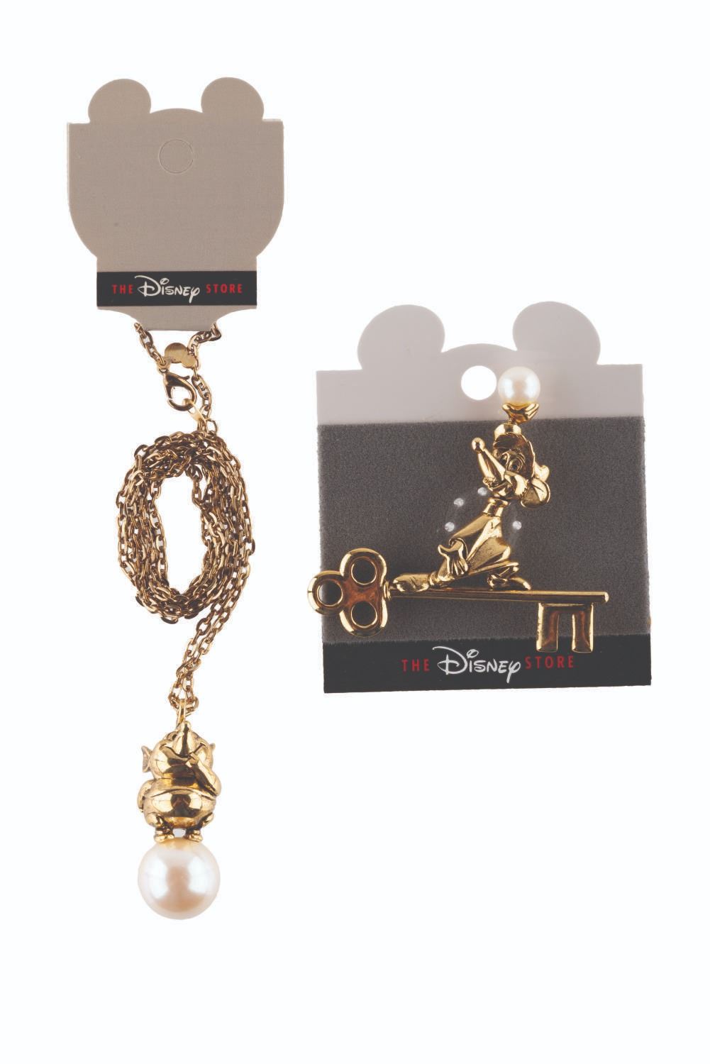 (Disney Store, 1990s) A large "Cinderella " pendant of Gus, with a brooch of Jaq on a key, both with faux pearl features. The 2 " pendant and 2.5 " x 2.75 " brooch are in fine condition on the original cards.