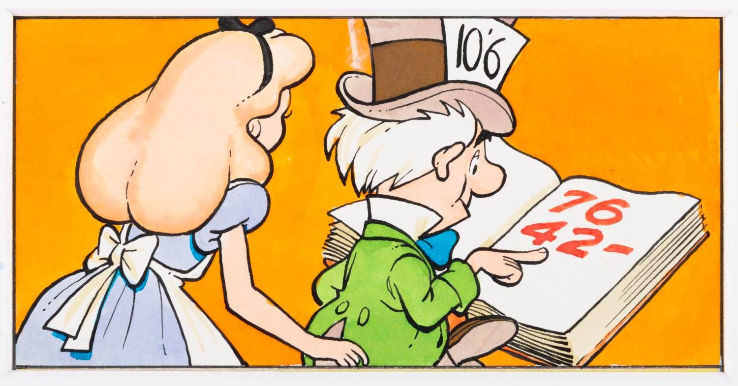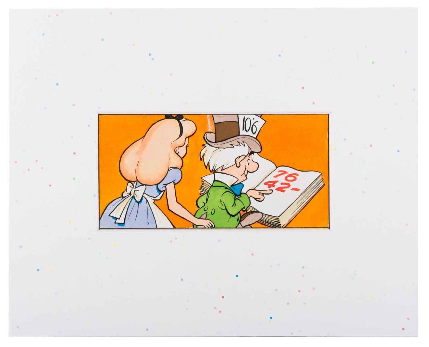 (Disney, 1970s) An original painting of Alice and the Mad Hatter from "Alice in Wonderland, " created for a book or magazine. Measuring 2.75 " x 5.75 " in an 8 " x 10 " matte with painted spots, the art is in very good condition with light wear.