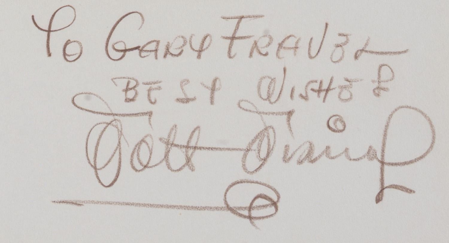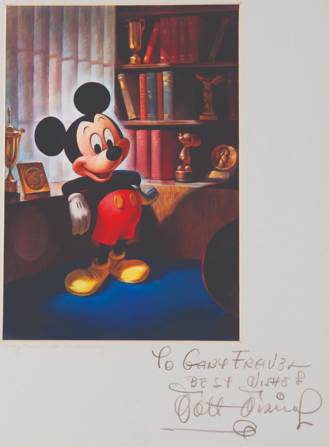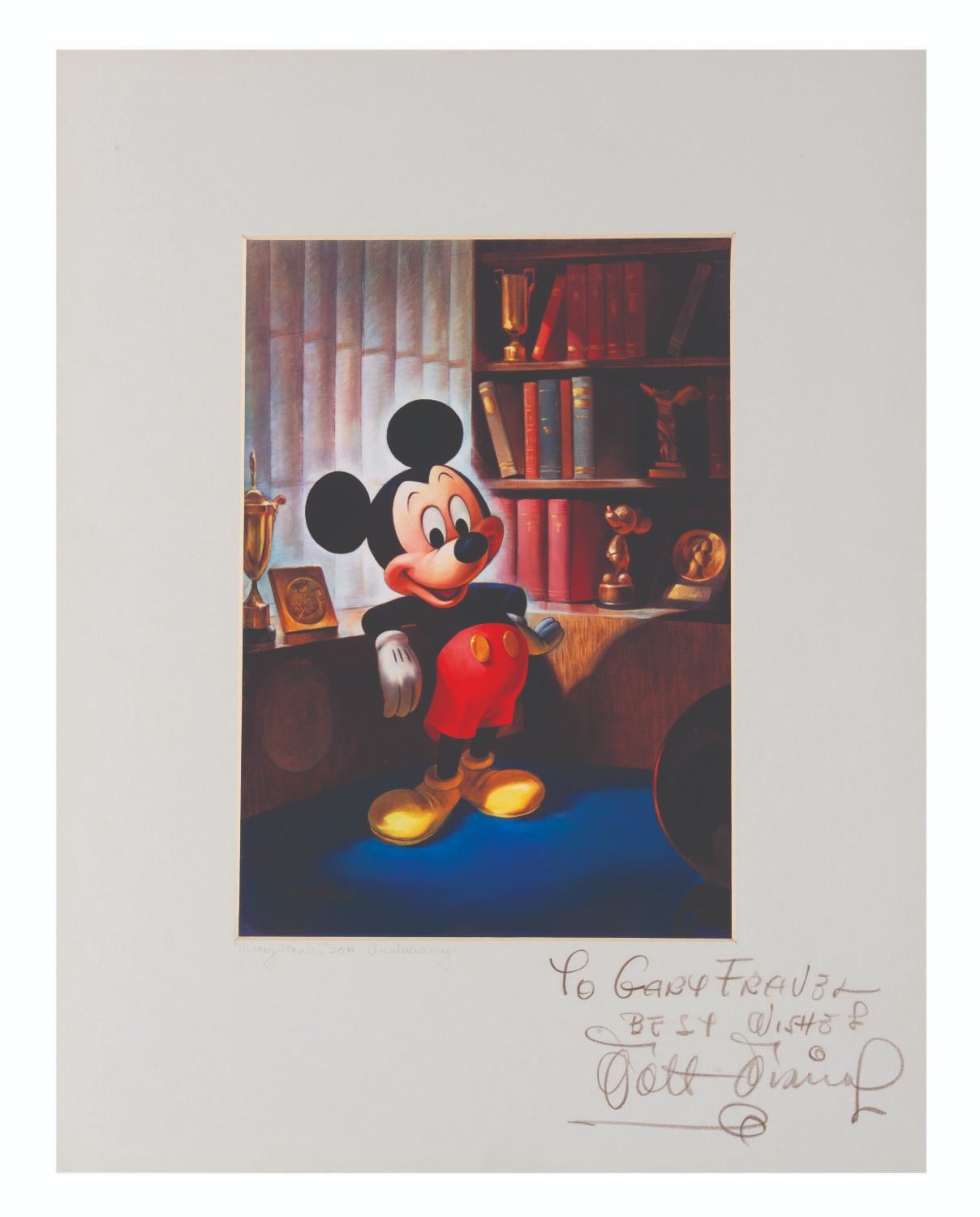(Disney, 1950s) A Mickey Mouse’s 25th Anniversary print signed by Walt Disney himself with a dedication. Disney Legend John Hench, Mickey’s official portrait artist, painted the original piece in 1953. Walt dedicated the print "To Gary Fravel, Best Wishes, Walt Disney. " Fravel had a major impact on the Disney Studio, co-creating and shepherding the Disney University training program with Van France. Measuring 7.5 " x 10.75 " in a 13.75 " x 17.25 " matte, the piece is in very good condition with light creases, spots of discoloration, and wear.