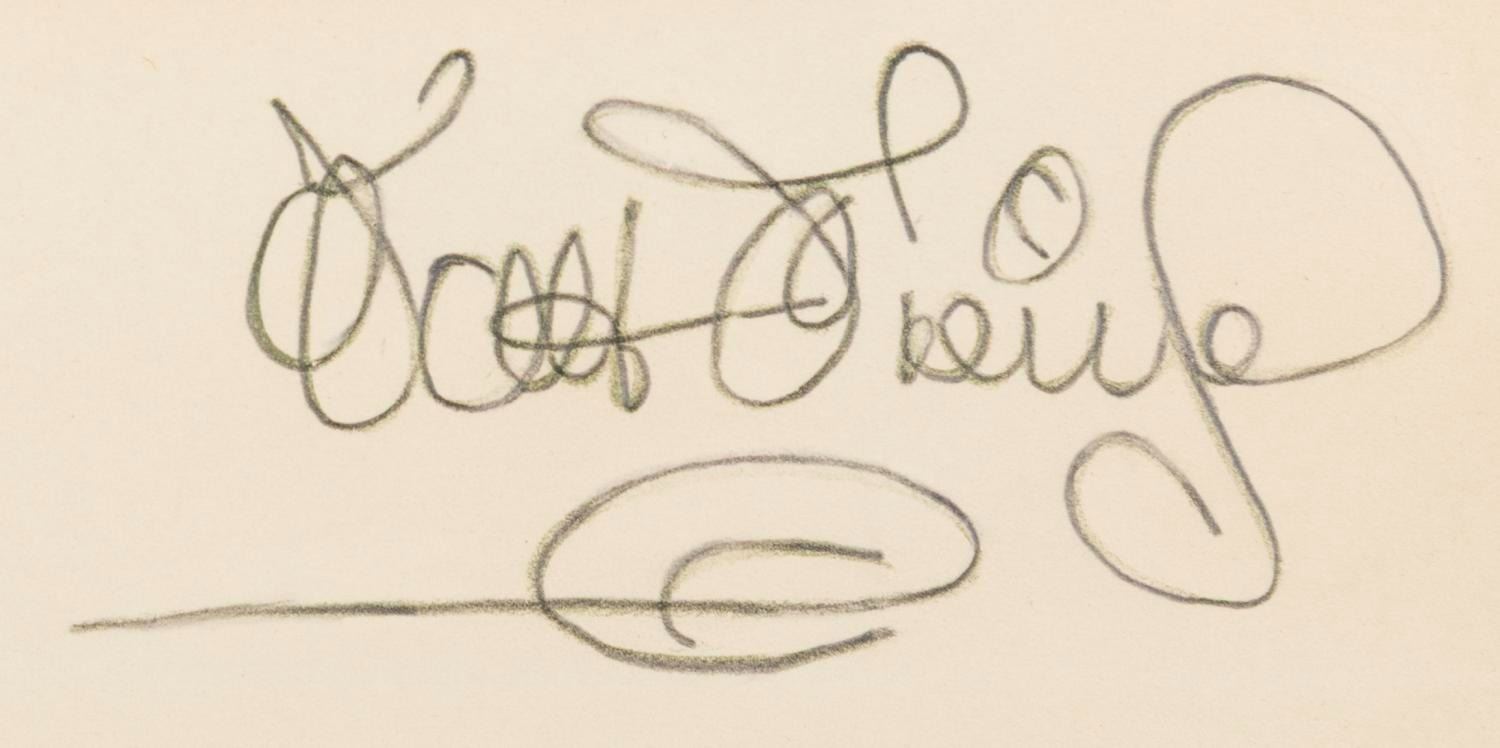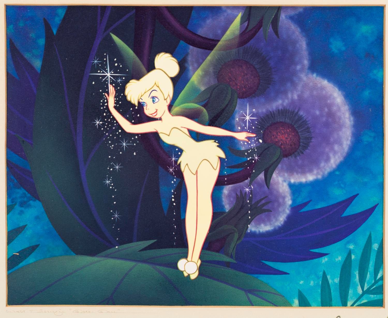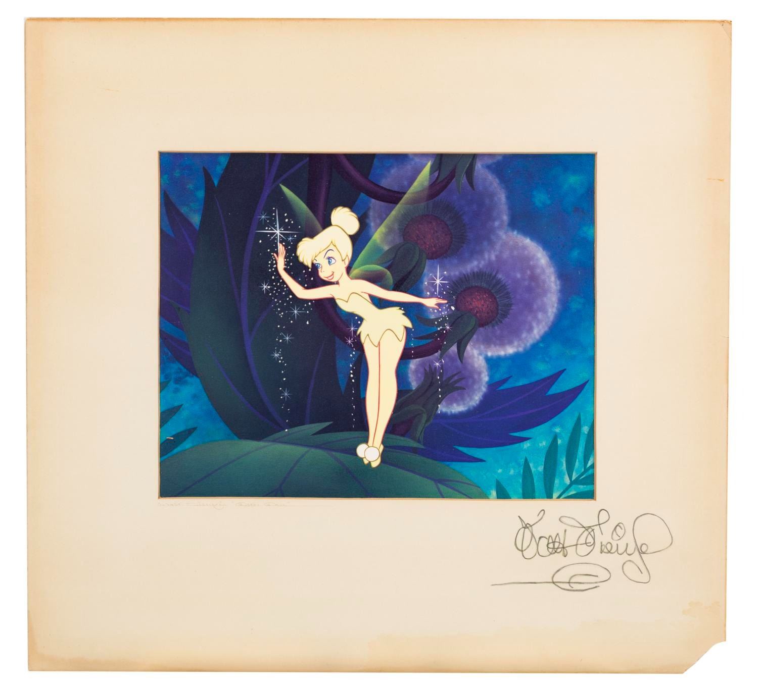 (Disney, 1950s-80s) A dye transfer of Tinker Bell from "Peter Pan, " adhered to a matte featuring a Studio artist's Walt Disney's signature. Dye transfers such as these were given as gifts to visitors of the Studio and sold through the Art Corner at Disneyland. Measuring 9 " x 11 ", the dye transfer is in very good condition with light waviness. The matte is in fair condition with edge tears, the bottom right corner missing, and discoloration from water contact and age.