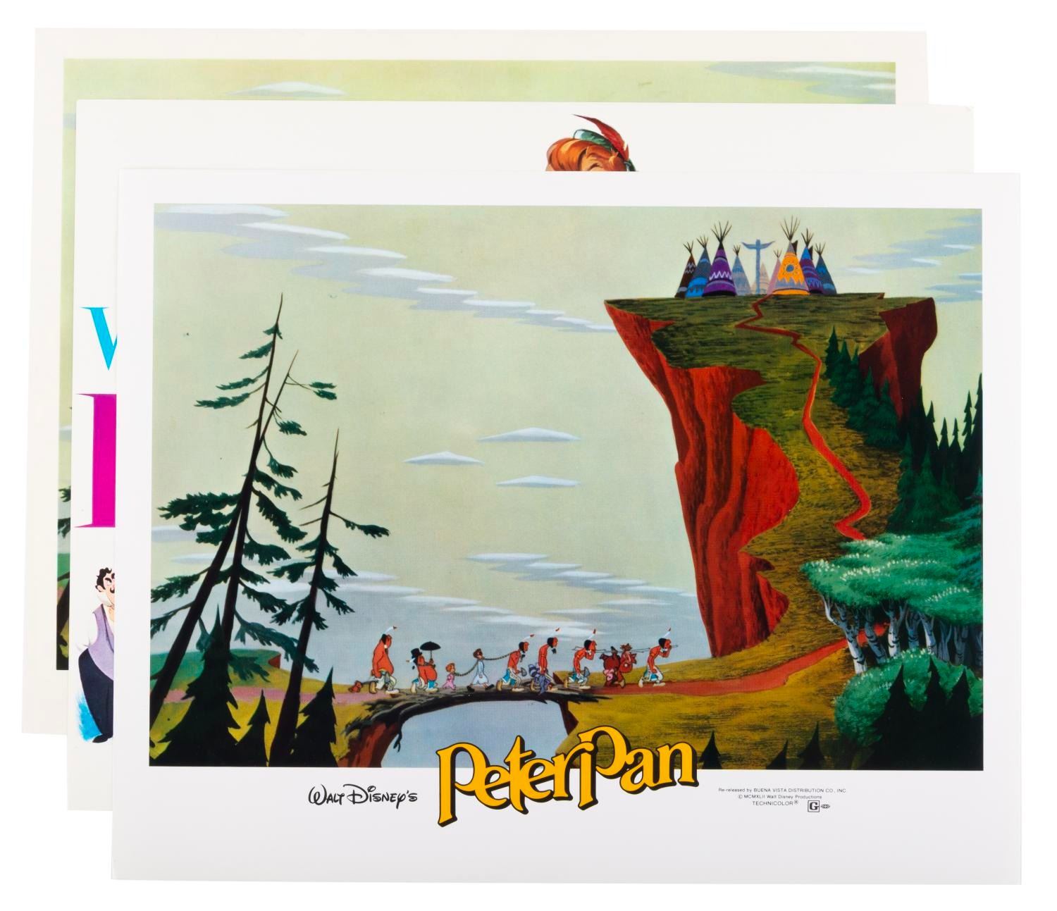 (Disney, 1958-76) A collection of three lobby cards from the 1958, 1962, and 1976 re-releases of "Peter Pan. " Measuring 11 " x 14 " each, the lobby cards display in good to very good condition with creases, scratches, light discoloration from age, and wear.