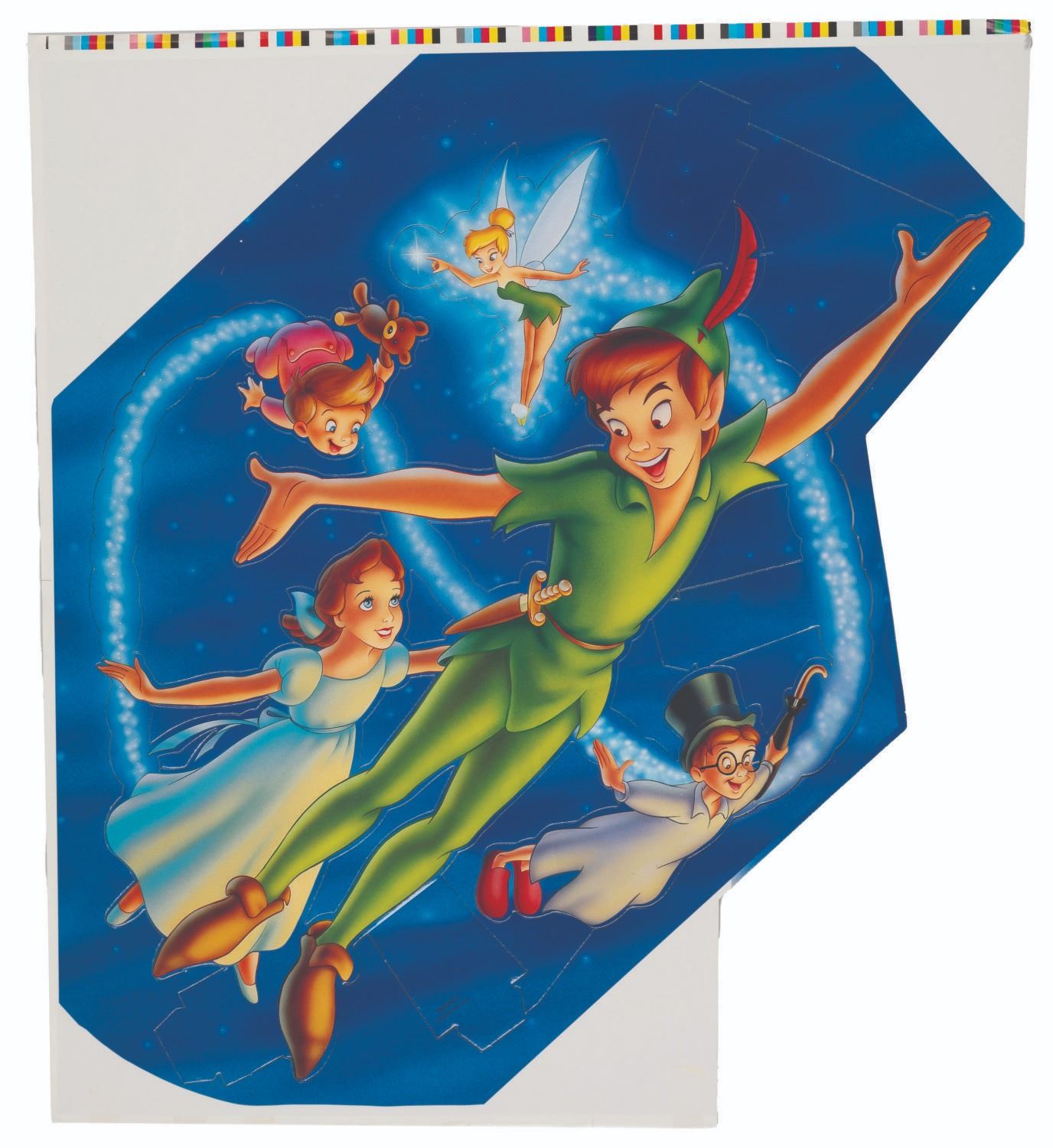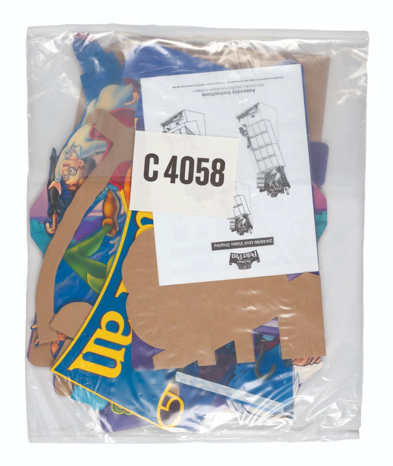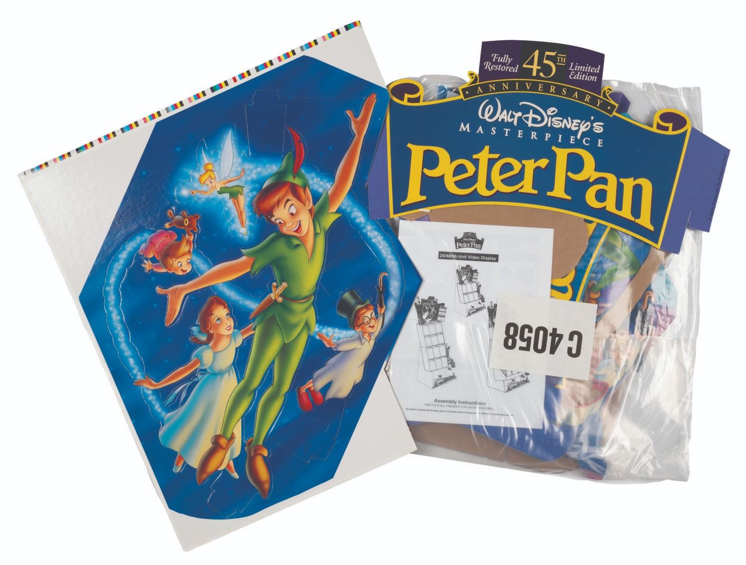 (Disney, 1998) A store standee for the limited edition release of the 1953 film "Peter Pan " on DVD. The kit includes a guide with assembly options to hold 24, 28, or 96 DVDs. Unassembled, the kit is in very good condition with light creases, tape residue, and wear, with partially-punched pieces.