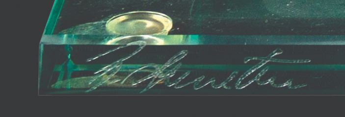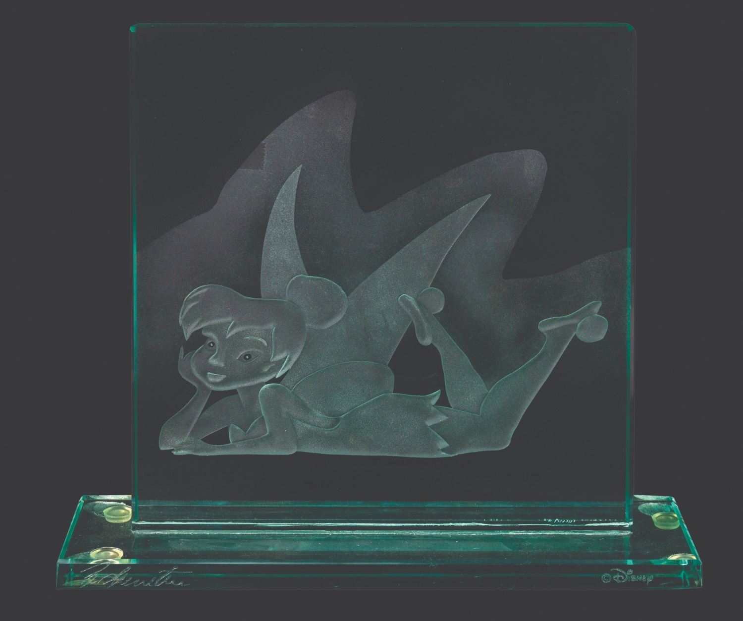 (Disney, 2000s) A decorative etched glass Tinker Bell plaque by artist Bob Guenther. Measuring 8.75 " x 10 " x 3 " deep, the plaque is in very good condition with minor surface wear, and three of the rubber feet along the base re-attached.