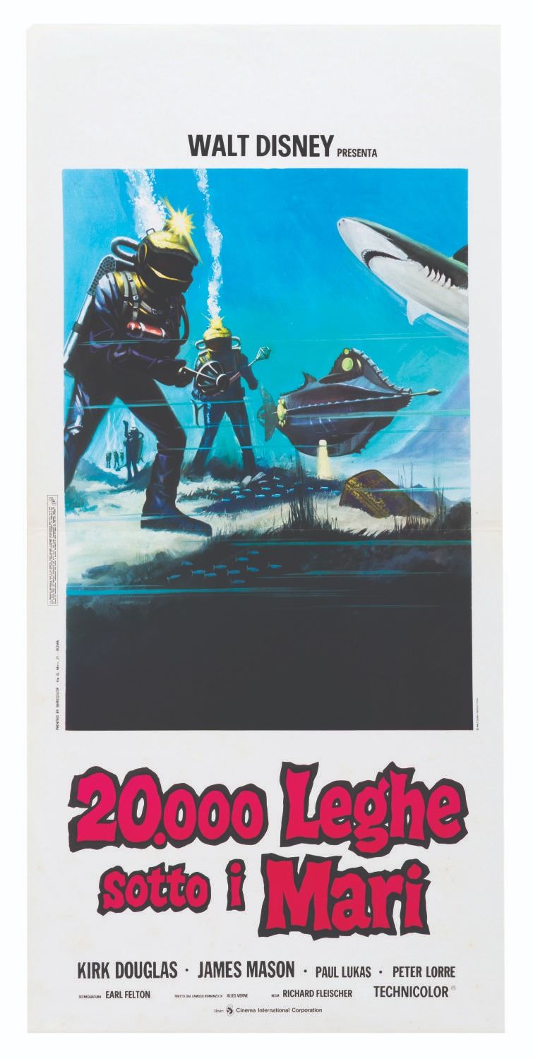 (Disney, 1970s) A locandina-sized poster for the 1970s Italian re-release of "20,000 Leagues Under the Sea. " Measuring 13 " x 27.5 ", the poster is in good condition with a factory fold across the center, very light spotting to the lower third, light edge wear, and a tiny chip out of the upper left corner.
