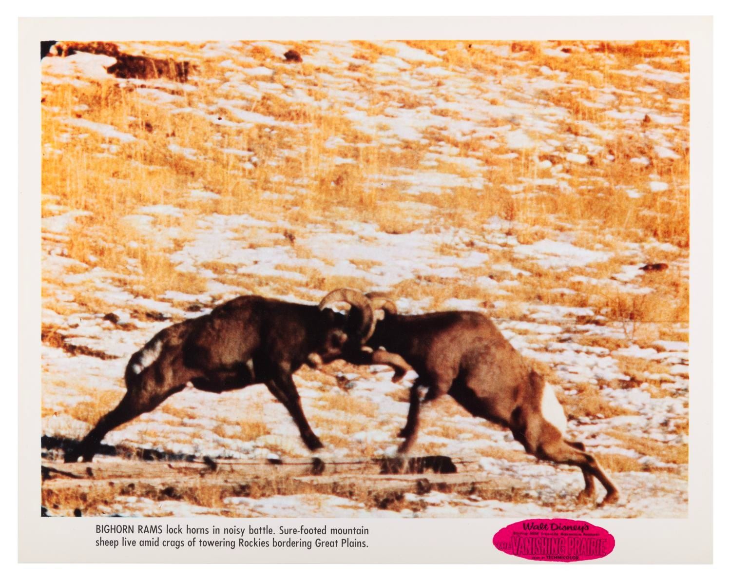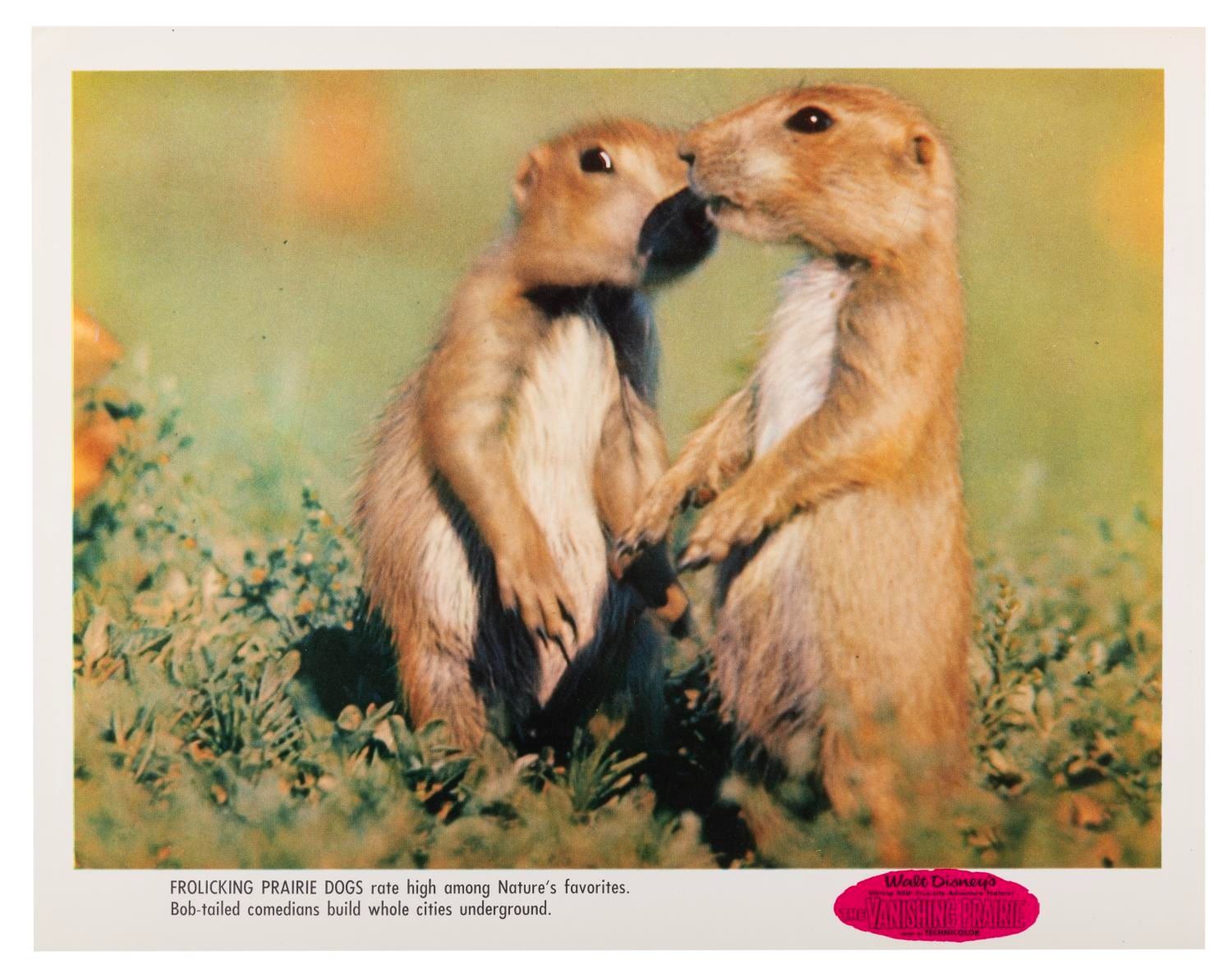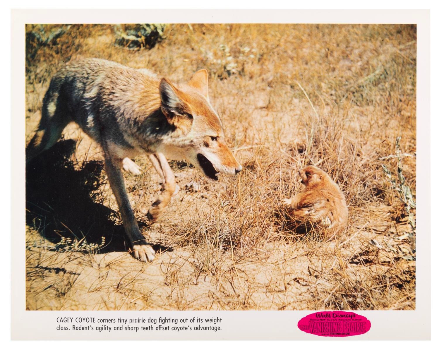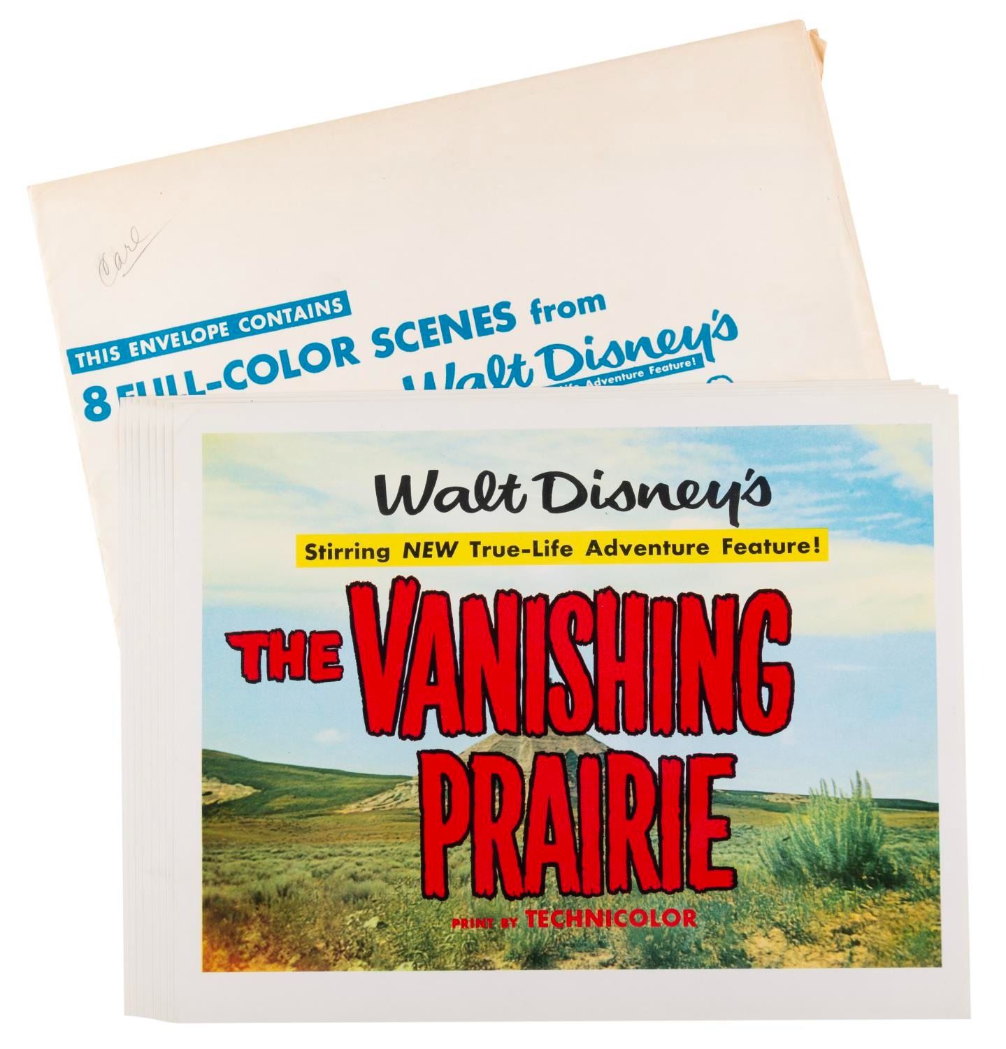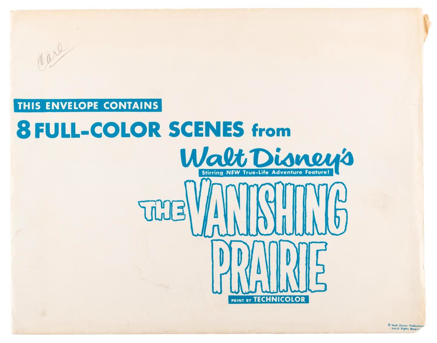 (Disney, 1954) A complete set of eight lobby cards for Walt Disney's "The Vanishing Prairie " with the original shipping envelope. Measuring 11.5 " x 14.5 ", the prints are in very good condition with light discoloration and creasing, while the envelope exhibits moderate discoloration, smudging, creasing, and pencil writing to the front.
