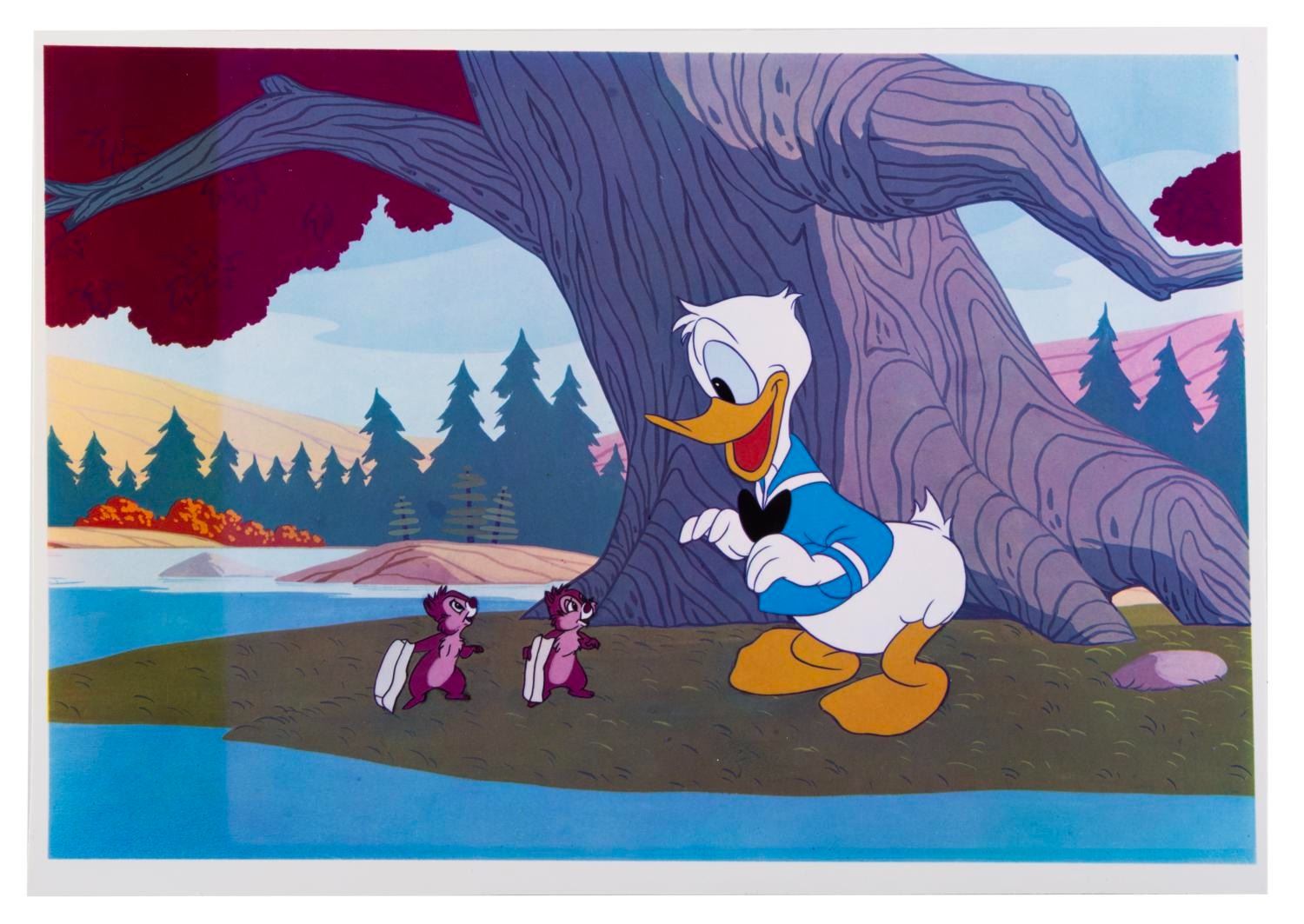 (Disney, 1950s) A Disney Studio photographic dye transfer of Chip, Dale, and Donald Duck in a scene from "Chips Ahoy. " Dye transfers such as these were given as gifts to visitors of the Studio and sold through the Art Corner at Disneyland. Measuring 9.25 " x 13.25 ", the dye transfer displays in very good condition with discoloration and corner peeling off the backing board.