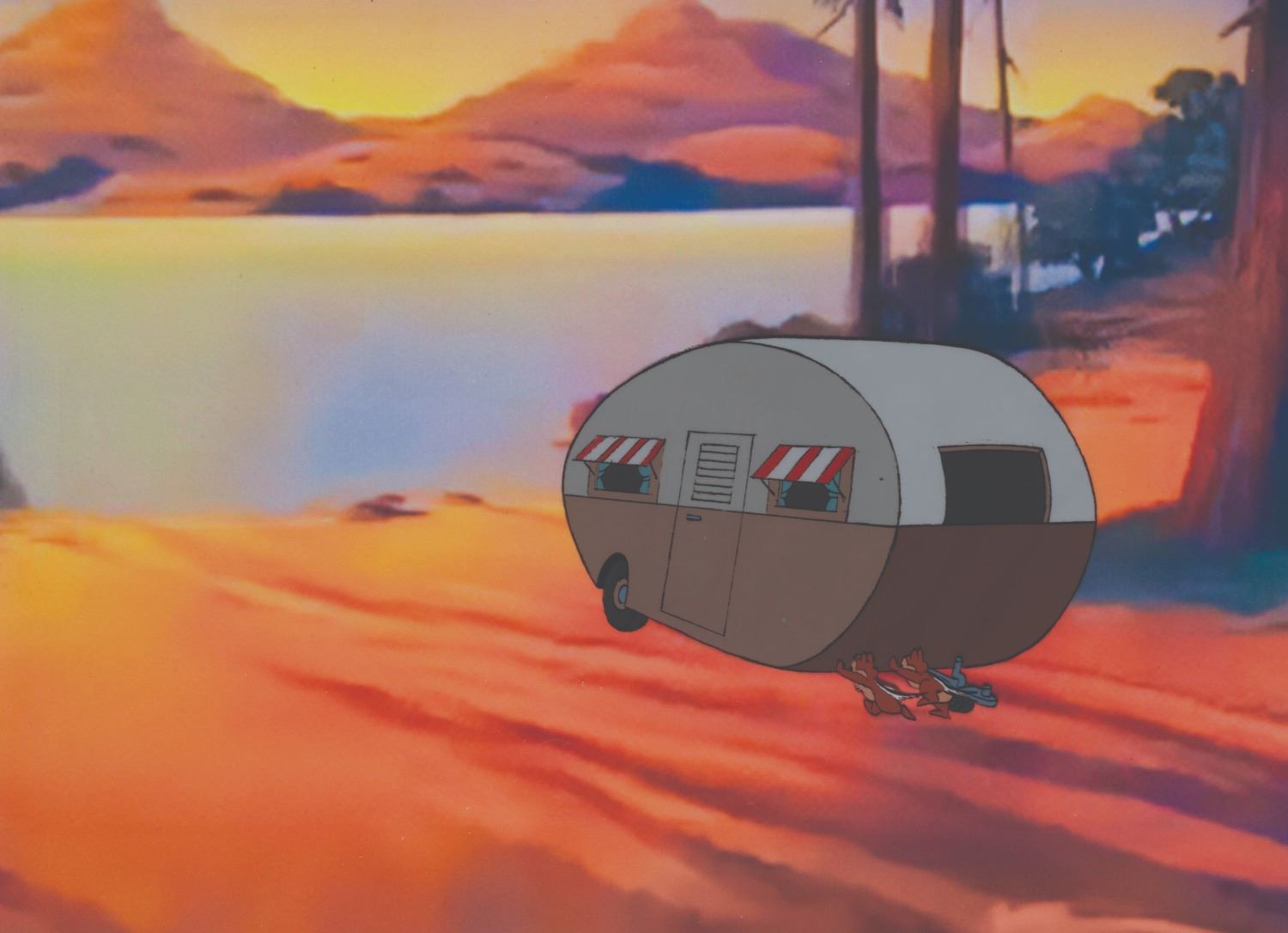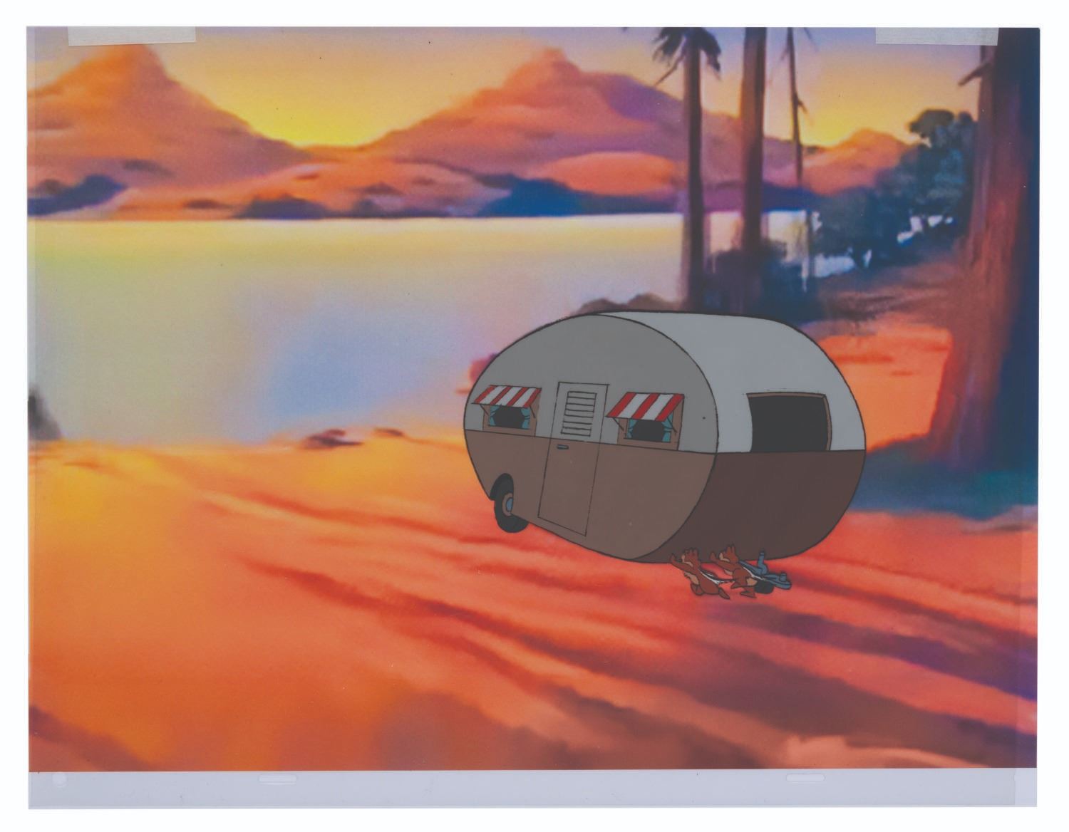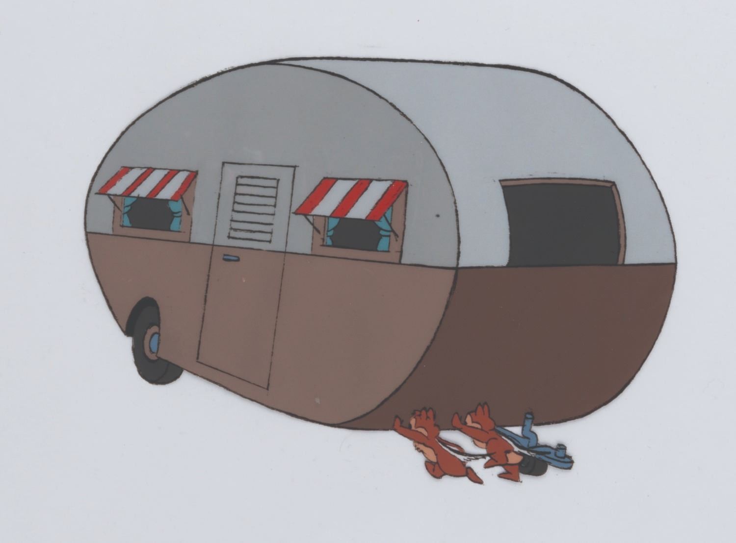 (Disney, 1959) A production cel of Chip ‘n Dale pushing a camper from the "Walt Disney Presents " episode "Duck Flies the Coop, " with a color copy background. The characters have an image size of 4.75 " x 6.5 " on 12.5 " x 16 " animation paper. The art is in very good condition with light scratches, minor cel curling, line loss, and spots of paint loss.