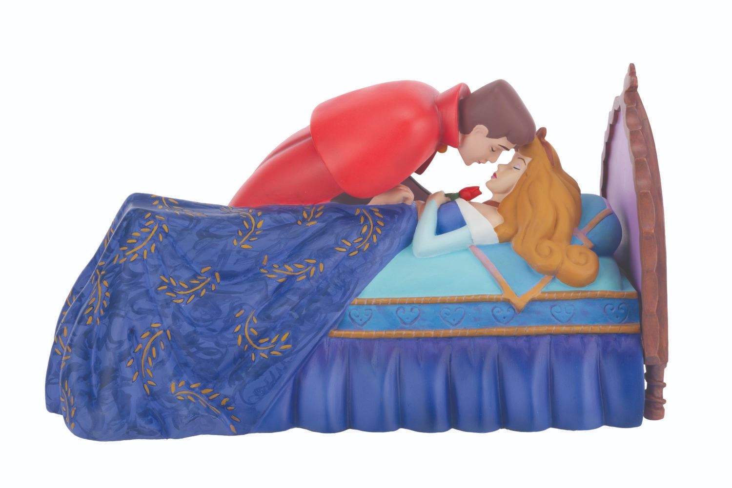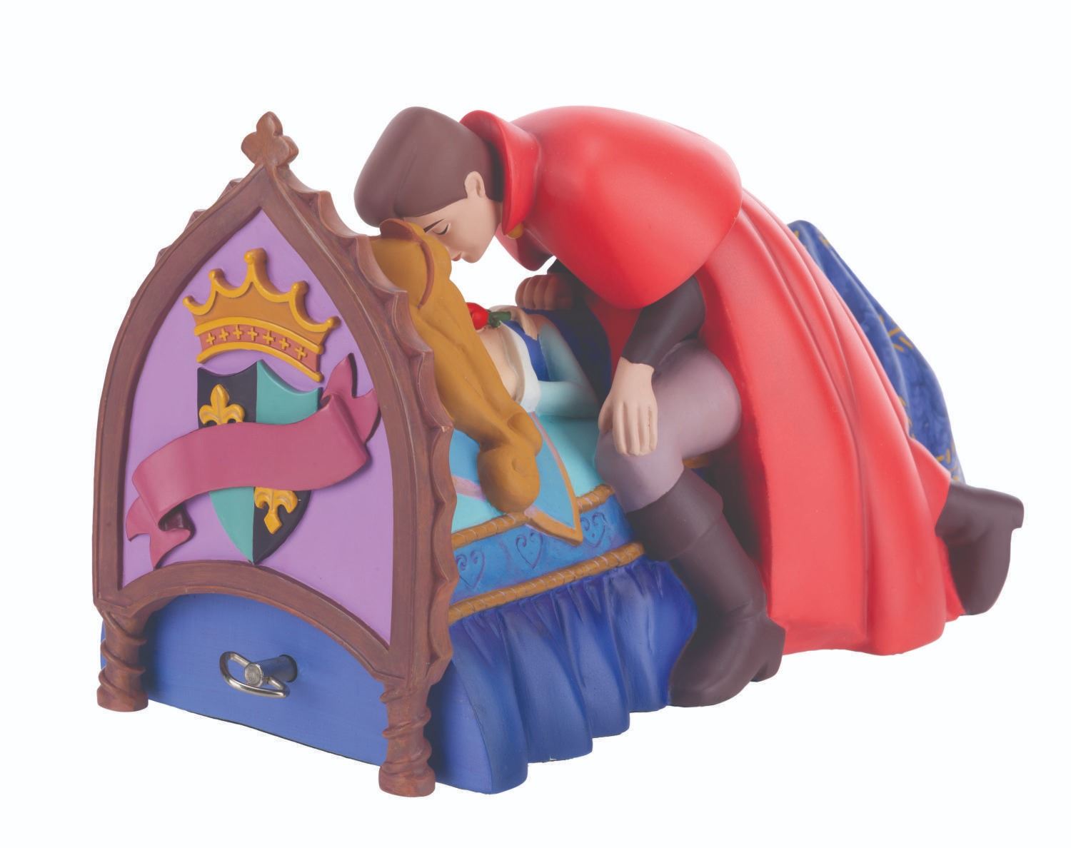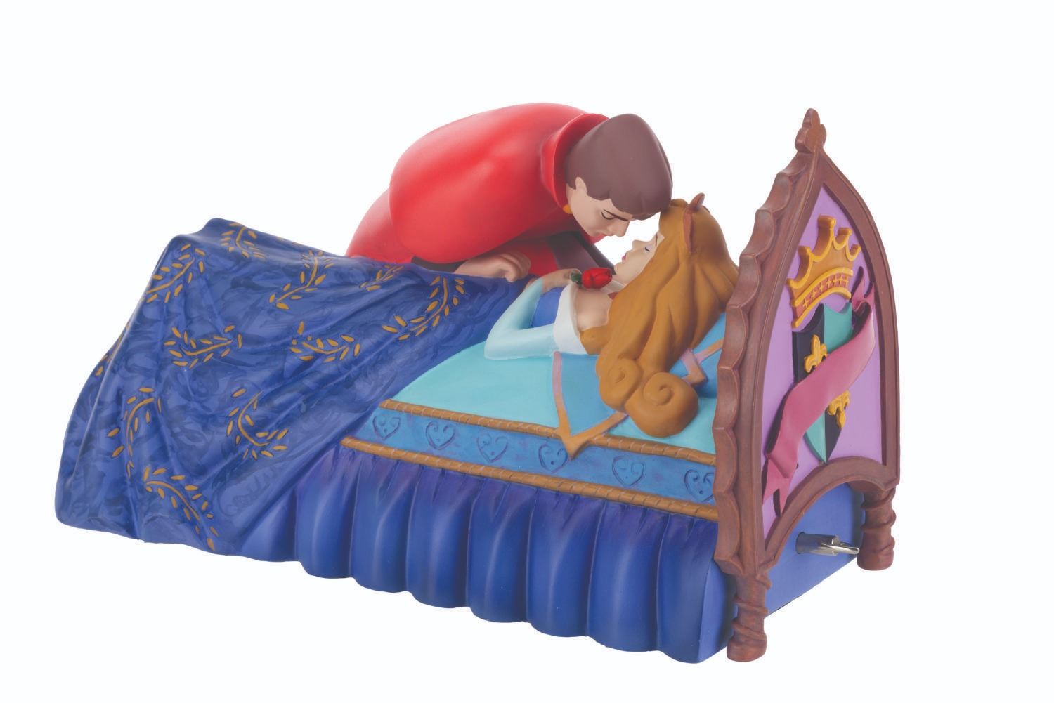 (Walt Disney Gallery, 1999) A ceramic figural scene commemorating the 40th Anniversary of "Sleeping Beauty. " The figurine depicts Prince Phillip leaning over Princess Aurora, asleep in her bed. When wound, the music feature plays "Once Upon a Dream. " Measuring 10.5 " x 6 " x 5.75 " tall, the piece numbered 1113/2500 is in fine working condition.