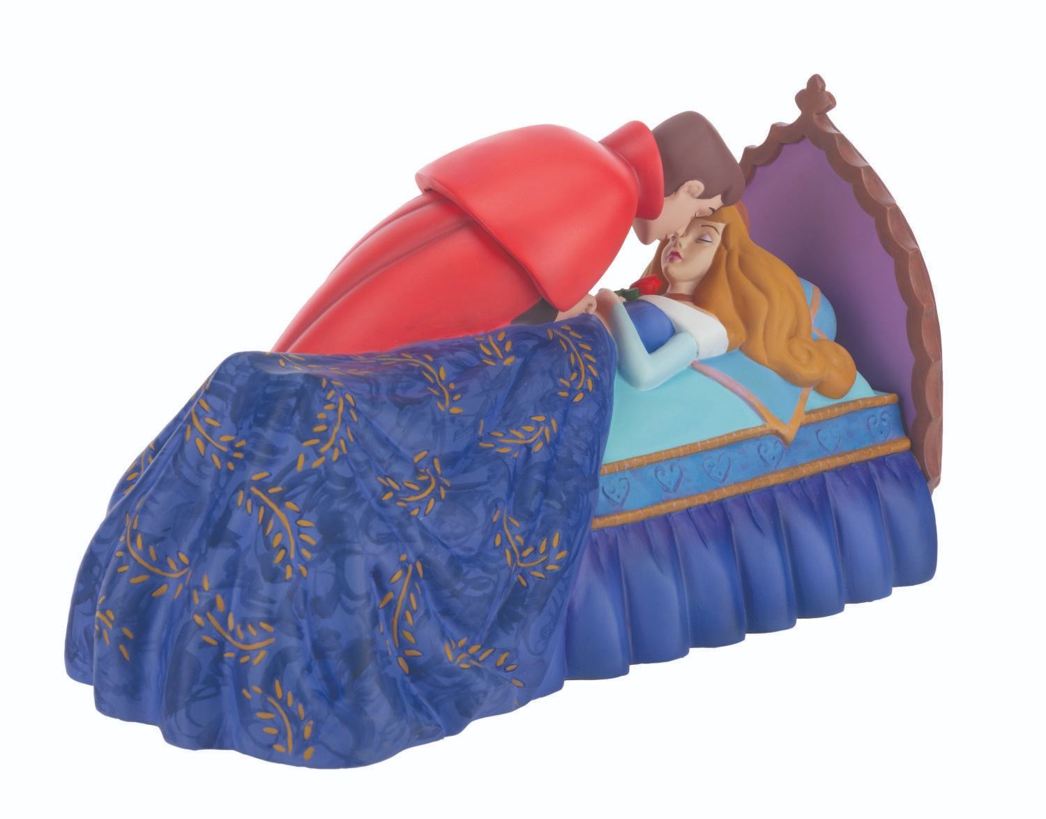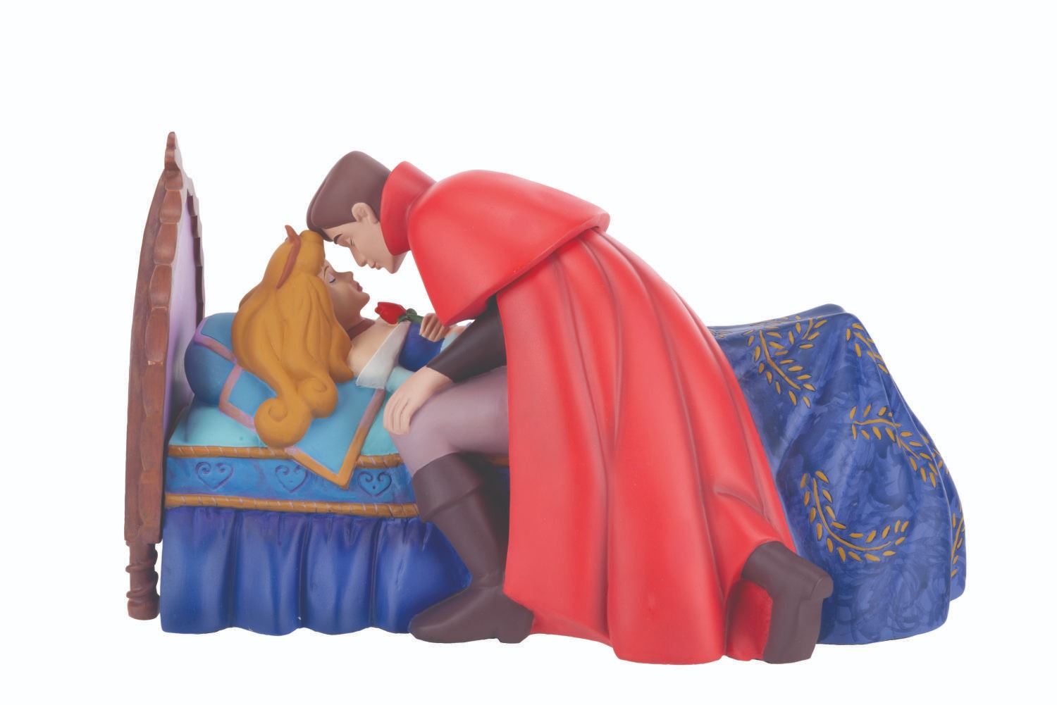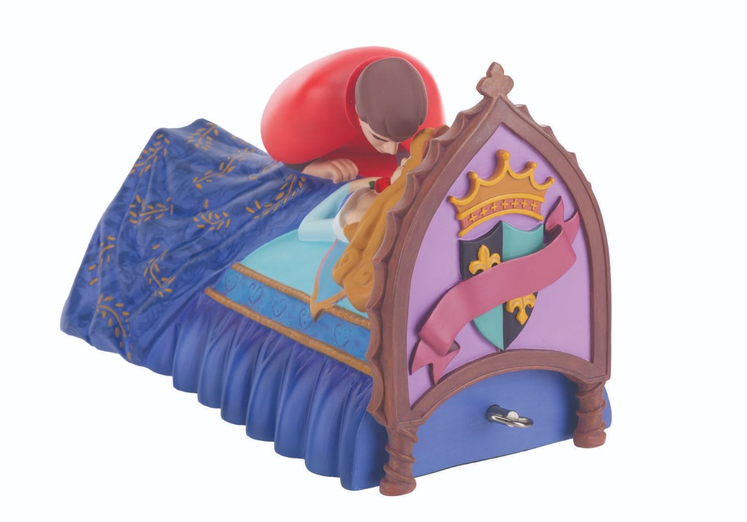 (Walt Disney Gallery, 1999) A ceramic figural scene commemorating the 40th Anniversary of "Sleeping Beauty. " The figurine depicts Prince Phillip leaning over Princess Aurora, asleep in her bed. When wound, the music feature plays "Once Upon a Dream. " Measuring 10.5 " x 6 " x 5.75 " tall, the piece numbered 1113/2500 is in fine working condition.