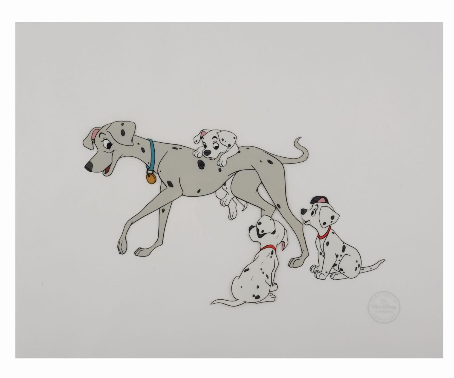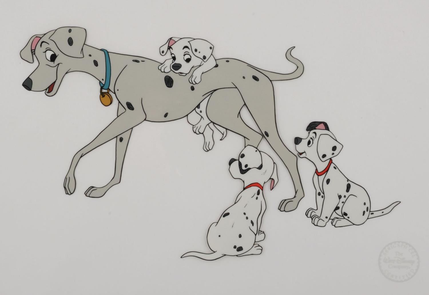 (Disney, 1990s-2000s) A limited edition sericel of Perdita and three of her puppies from Walt Disney’s "One Hundred and One Dalmatians. " The piece is a recreation of a frame that appears in the film. With an image size of 6 " x 10 " on the 11 " x 14 " cel, the limited edition 1000-piece is in very good condition with light handling wear.