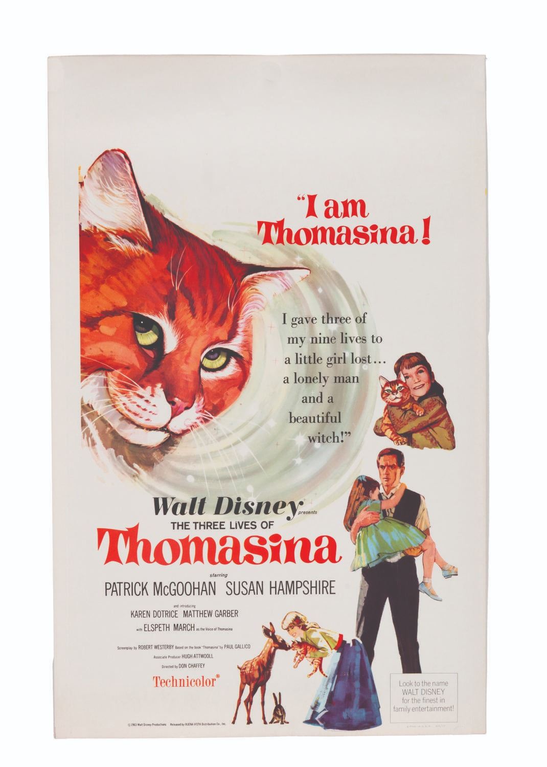 (Disney, 1963) A window card for Walt Disney's "The Three Lives of Thomasina. " Measuring 14 " x 22 ", the card is in very good condition with light creasing and discoloration.