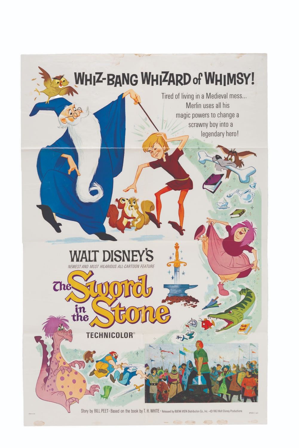 (Disney, 1963) A one-sheet for the original theatrical release of "The Sword in the Stone. " Measuring 27 " x 41 ", the poster is in fair condition with wear and creases along original folds, pinholes at corners, very slight separation at center fold points, and several spots of dark discoloration along the top and bottom edges.