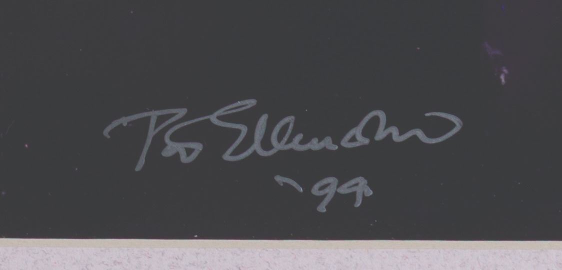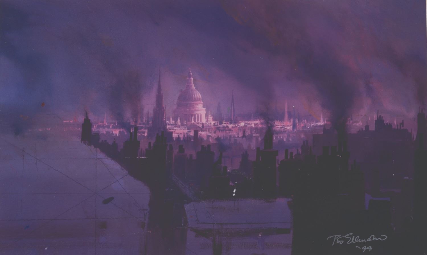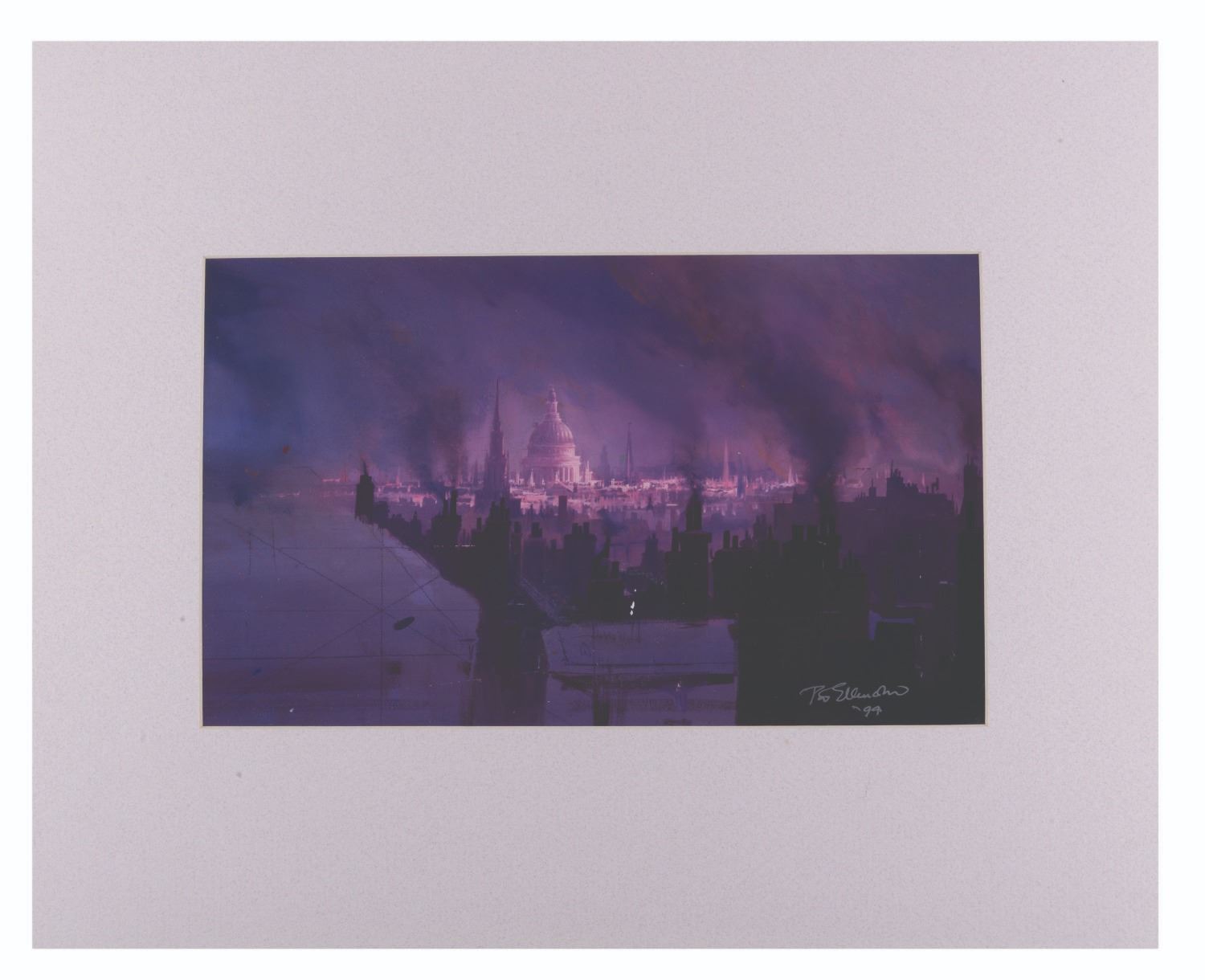 (1994) A print of a "Mary Poppins " matte painting of the rooftops of London, signed by the artist, Disney Legend Peter Ellenshaw. With a visible image of 8.25 " x 13.5 " in a 16 " x 20 " matte, the signed print is in good condition with a few small scuffs and spots of paper loss in the image.