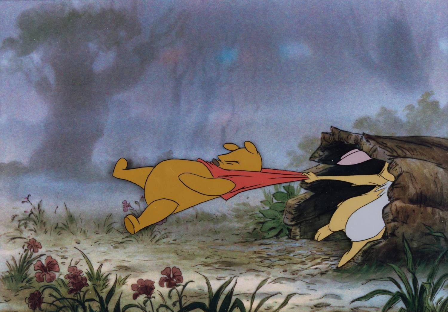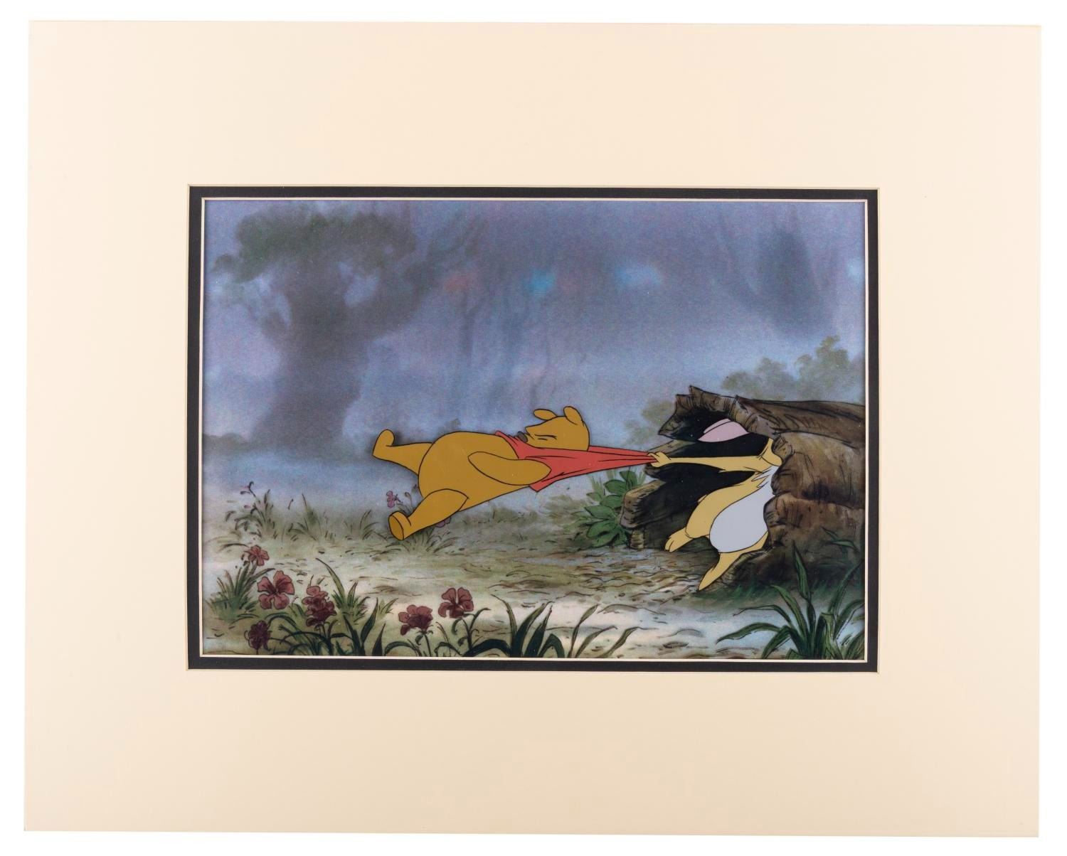 (Disney, 1977) An original production cel of Winnie the Pooh and Rabbit from "The Many Adventures of Winnie the Pooh, " with a color copy background. The characters have an image size of 3.5 " x 8 " on a 9 " x 13 " visible cel. The entire matted piece measures 16 " x 20 " and is in very good condition with light scratches and wear from production use.