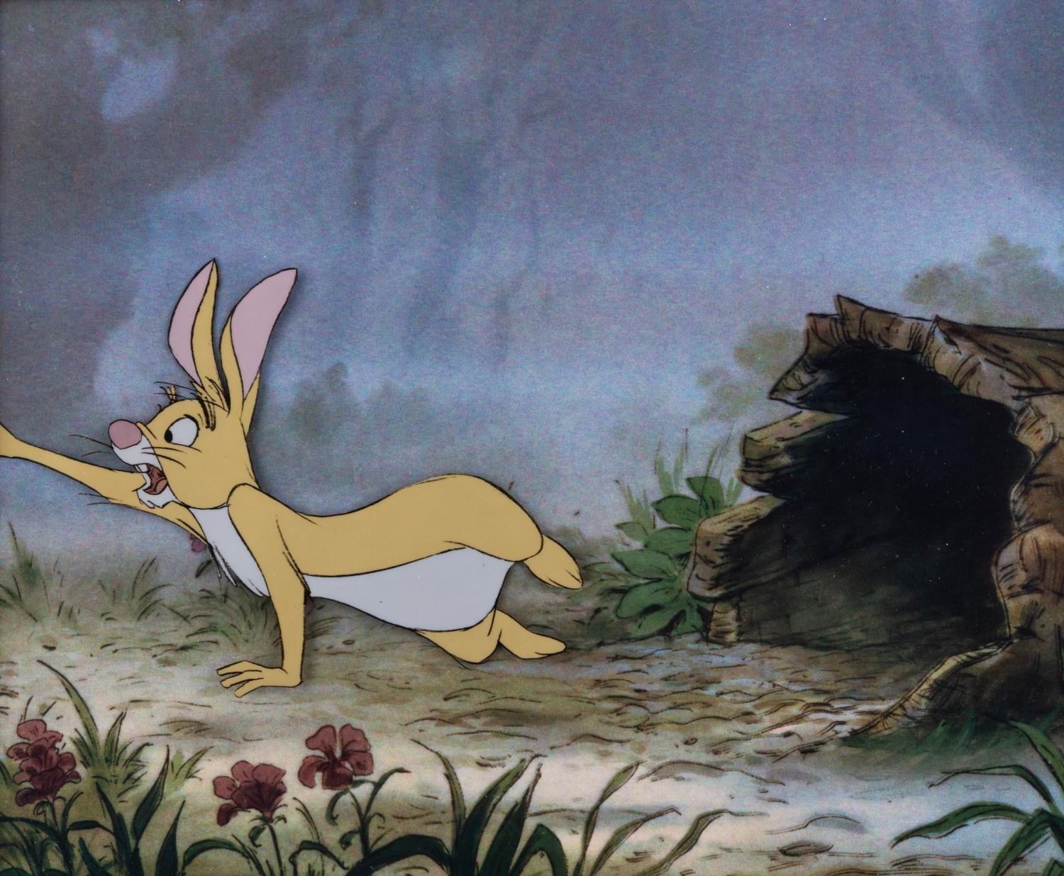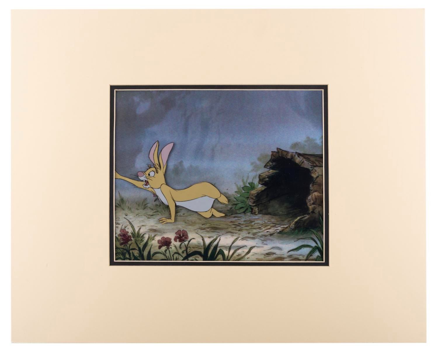 (Disney, 1977) An original production cel of Rabbit from "The Many Adventures of Winnie the Pooh, " with a color copy background. Rabbit has an image size of 4 " x 5.5 " on an 8 " x 10 " visible cel. The entire matted piece measures 16 " x 20 " and is in very good condition with light wear from production use.
