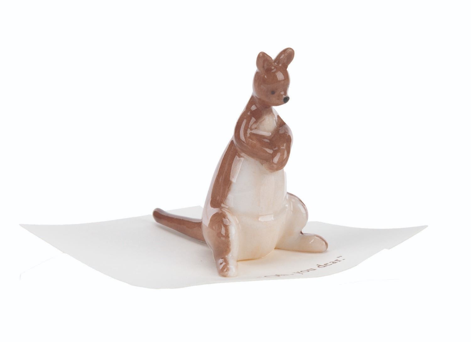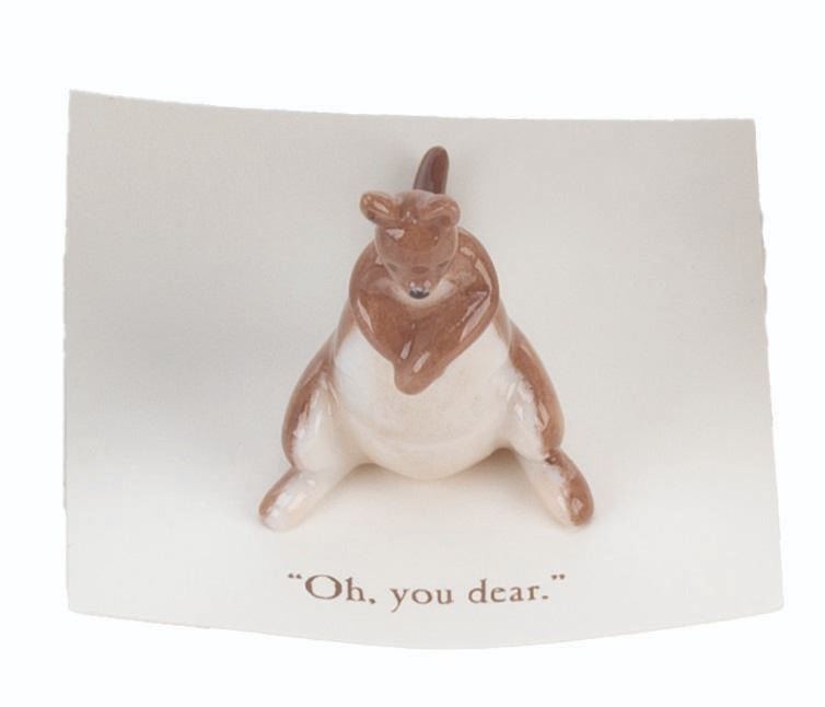 (Michel and Co., 1990s) A mini ceramic figurine of Kanga, inspired by the original illustrations for the Winnie the Pooh books by E. H. Shepard. The figurine is attached to a card with a quote that reads, "Oh, you dear. " Measuring 1.5 " tall, the mini figurine is in fine condition.