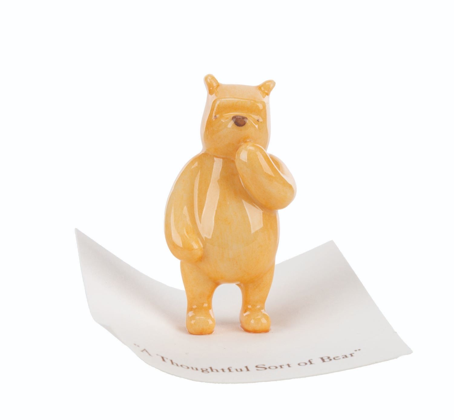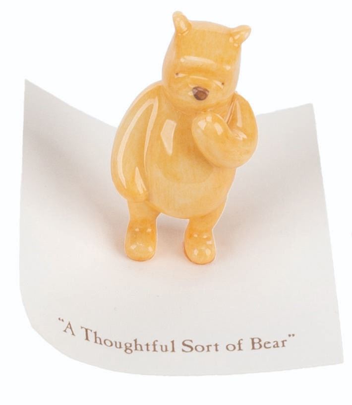 (Michel and Co., 1990s) A mini ceramic figurine of Winnie the Pooh, inspired by the original illustrations for the books by E. H. Shepard. The figure is attached to a card with a quote that reads "A Thoughtful Sort of Bear. " Measuring 1.5 " tall, the figurine is in fine condition.