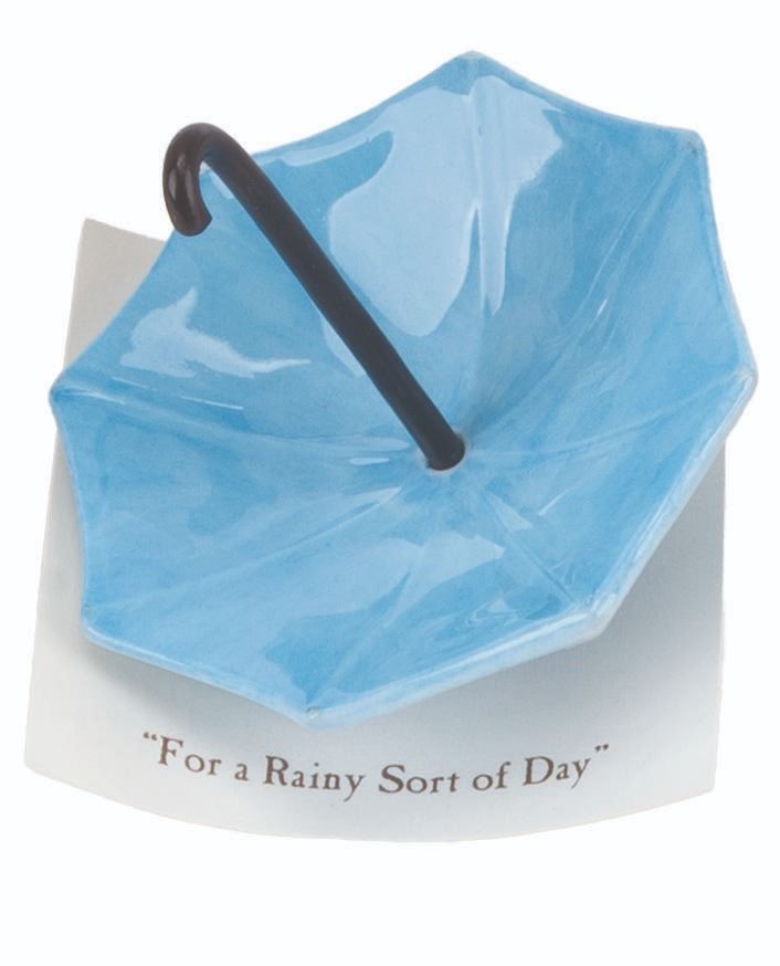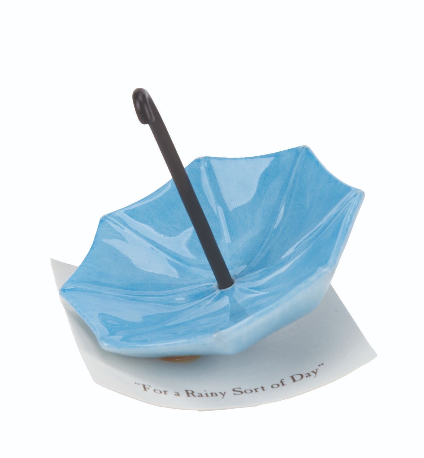 (Michel and Co., 1990s) A mini "Winnie the Pooh " ceramic figurine of an umbrella inspired by the original illustrations for the books by E. H. Shepard. The figurine is attached to a card with a quote that reads, "For a Rainy Sort of Day. " Measuring 2 " tall and 2.25 " in diameter, the mini figurine is in fine condition.