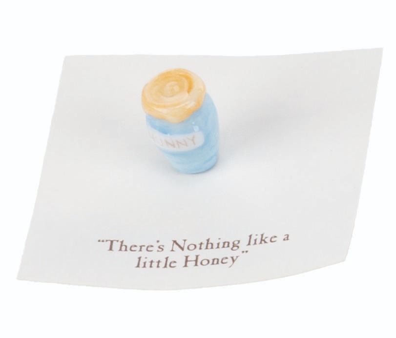 (Michel and Co., 1990s) A mini "Winnie the Pooh " ceramic figurine of a honey pot inspired by the original illustrations for the books by E. H. Shepard. The figurine is attached to a card with a quote that reads "There’s Nothing like a little Honey. " Measuring 0.5 " tall, the mini figurine is in fine condition.