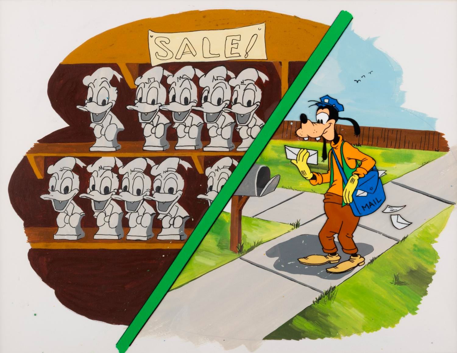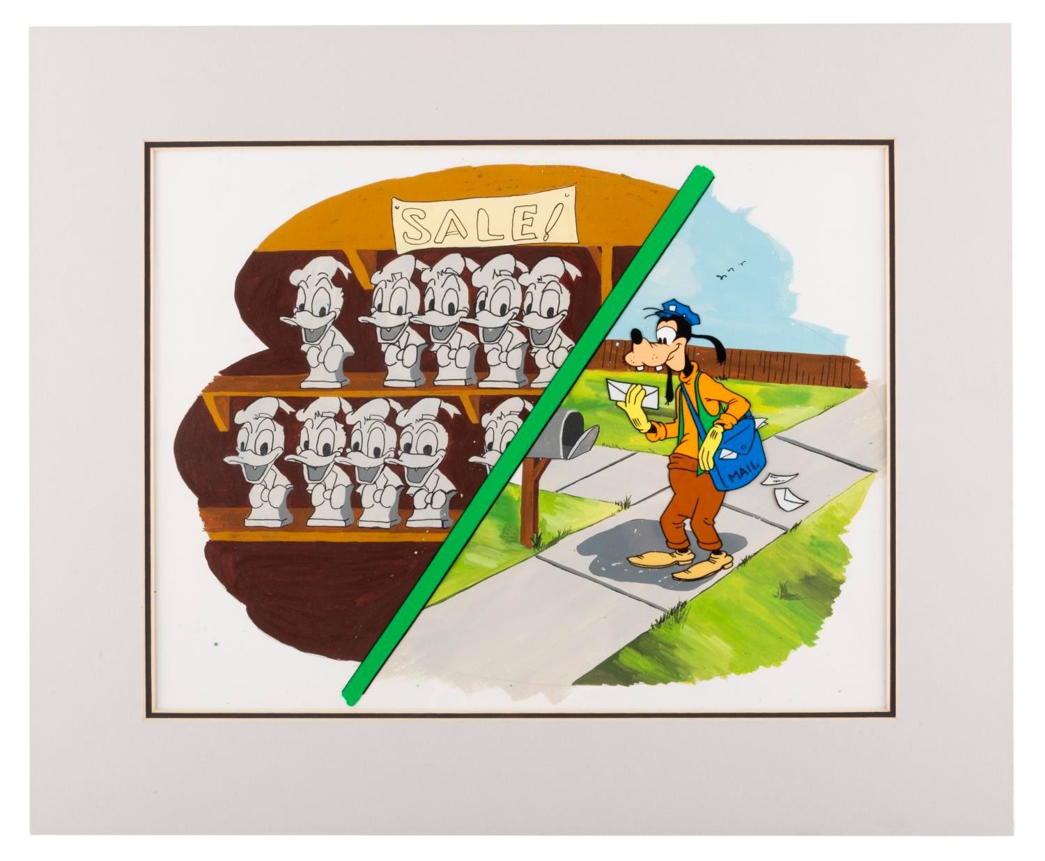 (Disney, 1960s-70s) An original production cel of Goofy and background featuring Donald Duck busts from a Goofy educational filmstrip. Measuring 10.5 " x 14 " in a 13.5 " x 16.5 " matte, the art is in very good condition with scratches and light wear.