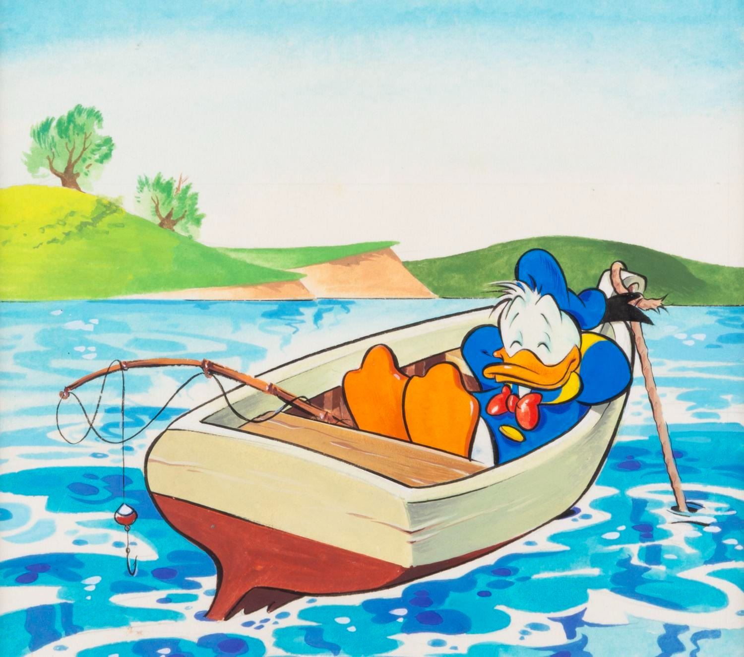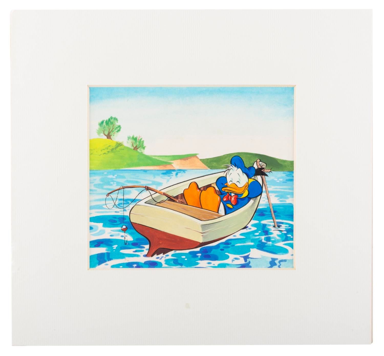 (Disney, 1970s) An original painting of Donald Duck fishing, created for a 1970s comic book. Measuring 4.5 " x 5.25 " in an 8.5 " x 9.25 " matte, the art is in fine condition, while the frame exhibits light wear.