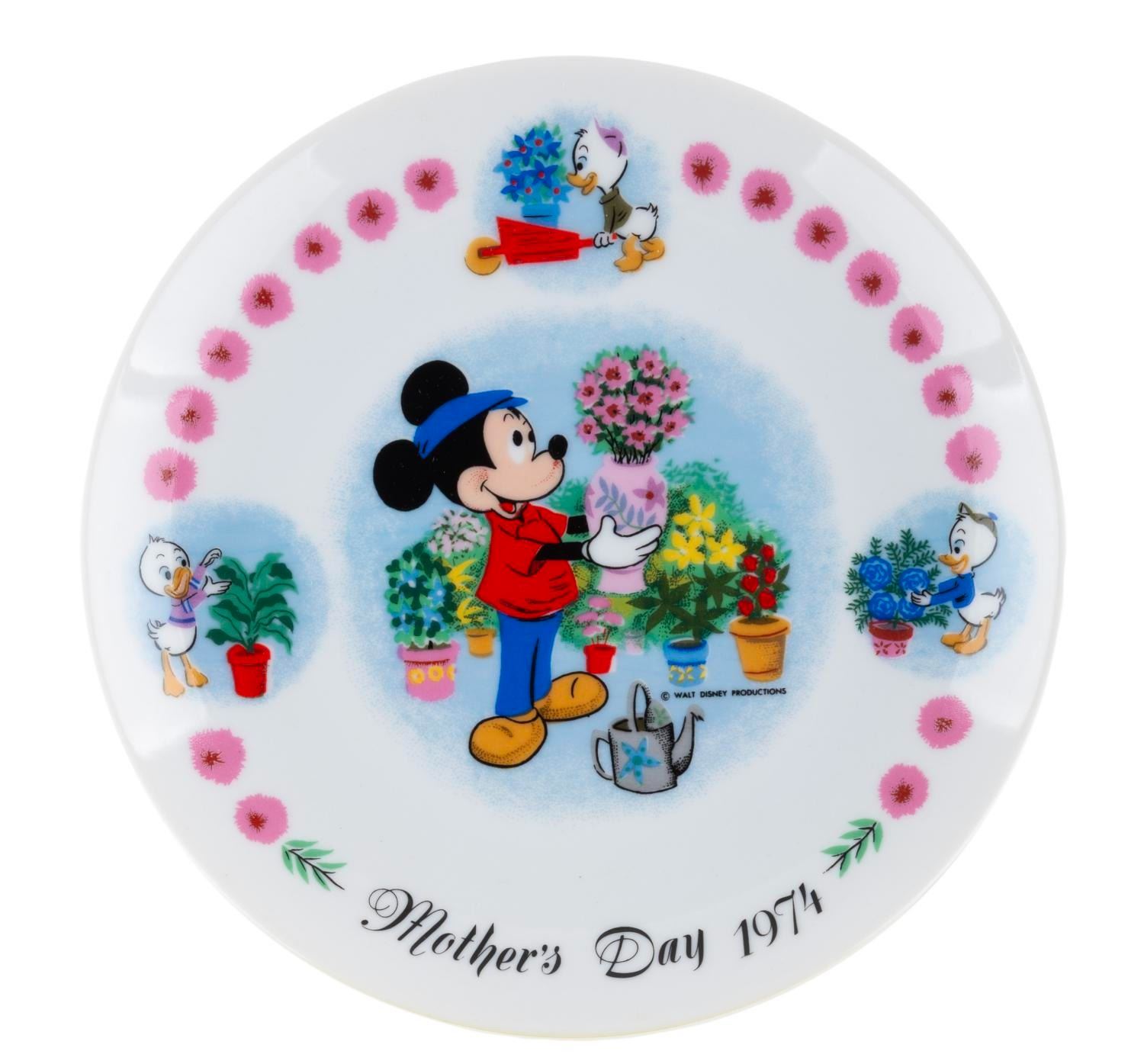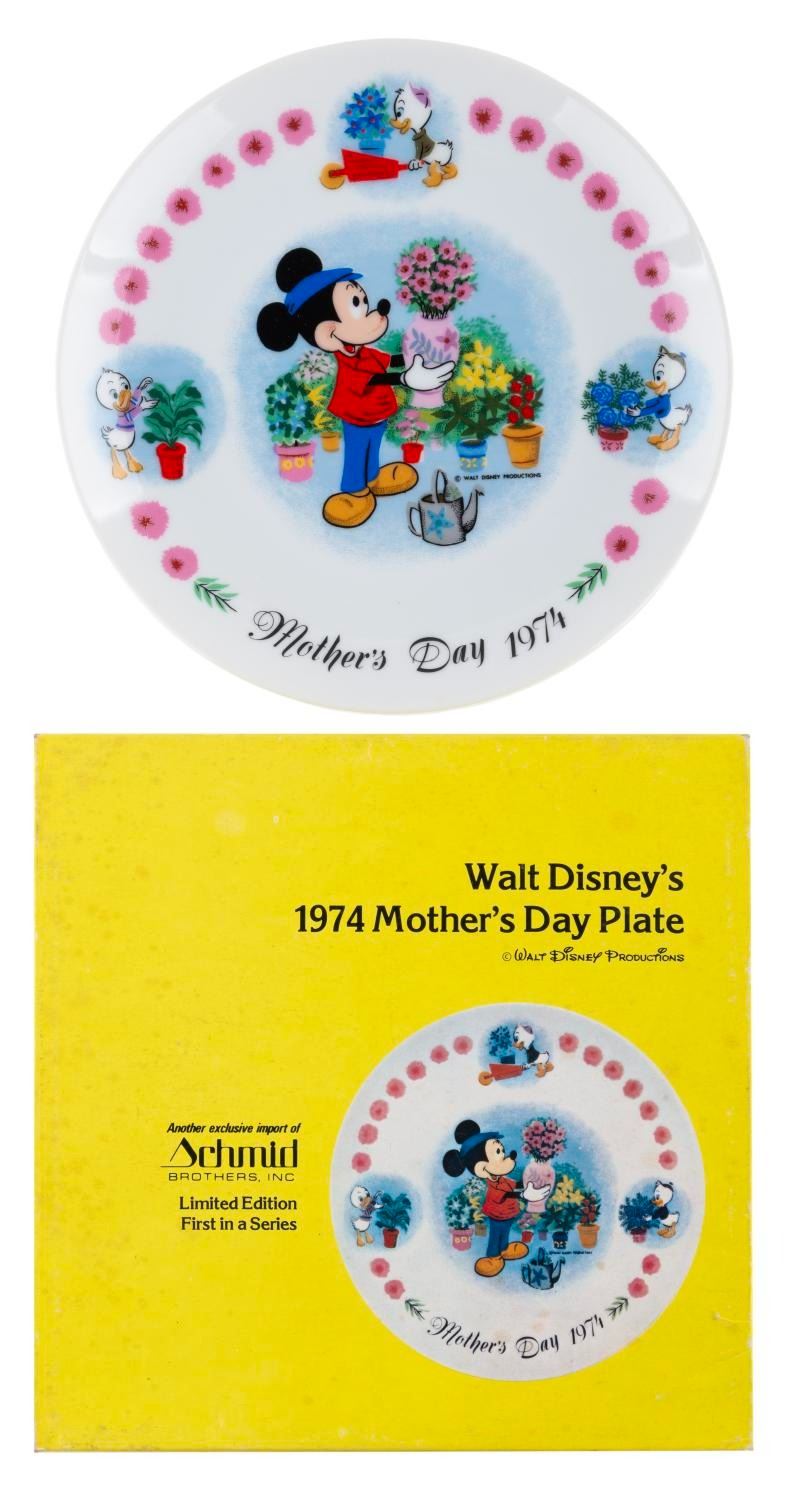 (Schmid, 1974) A Walt Disney’s 1974 Mother's Day plate featuring Mickey Mouse and Huey, Dewey, and Louie. Measuring 7.5 " in diameter, the ceramic plate is in fine condition, with the original box.
