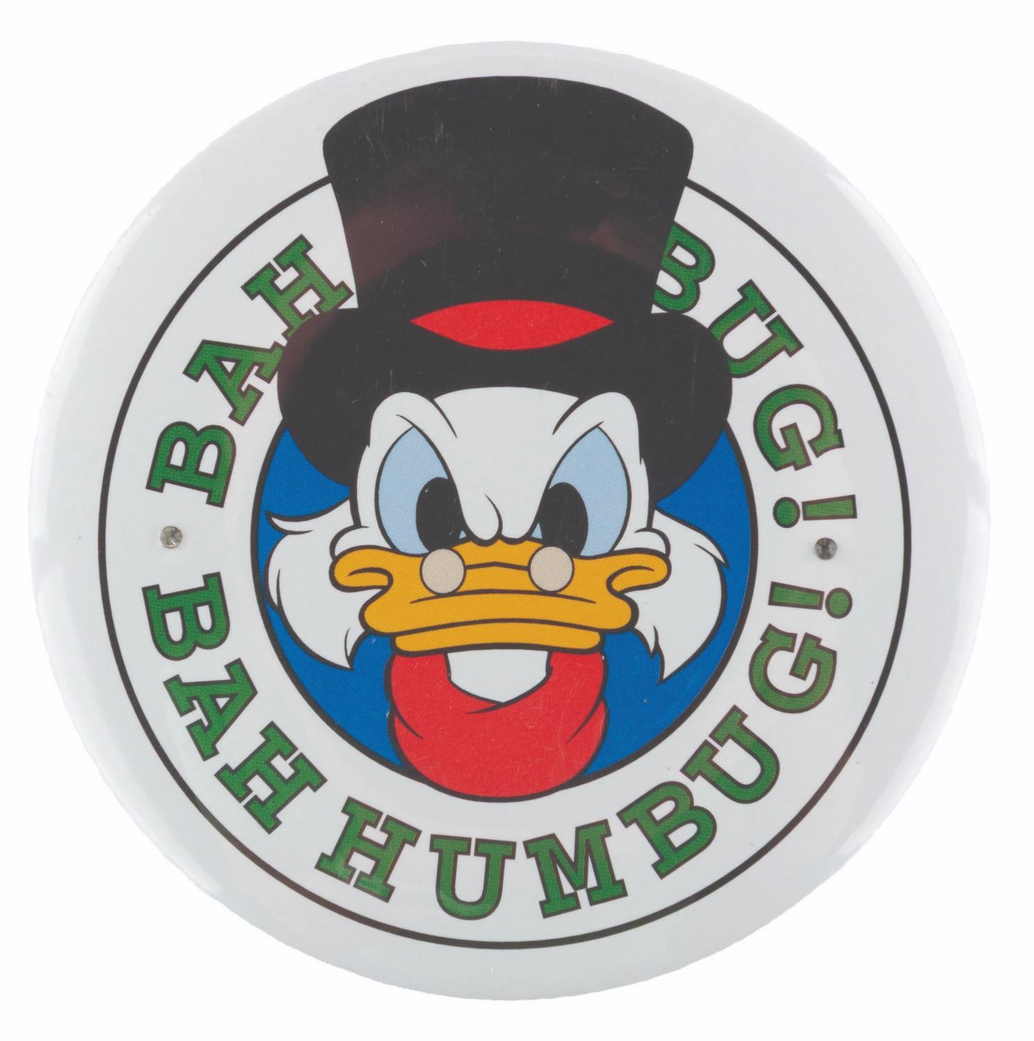 (Disney Parks, 1990s) A light-up pinback button of Scrooge McDuck declaring "Bah! Humbug. " Measuring 3 " in diameter, the button is in good condition with oxidation to the reverse and requires a battery and possibly service to function.