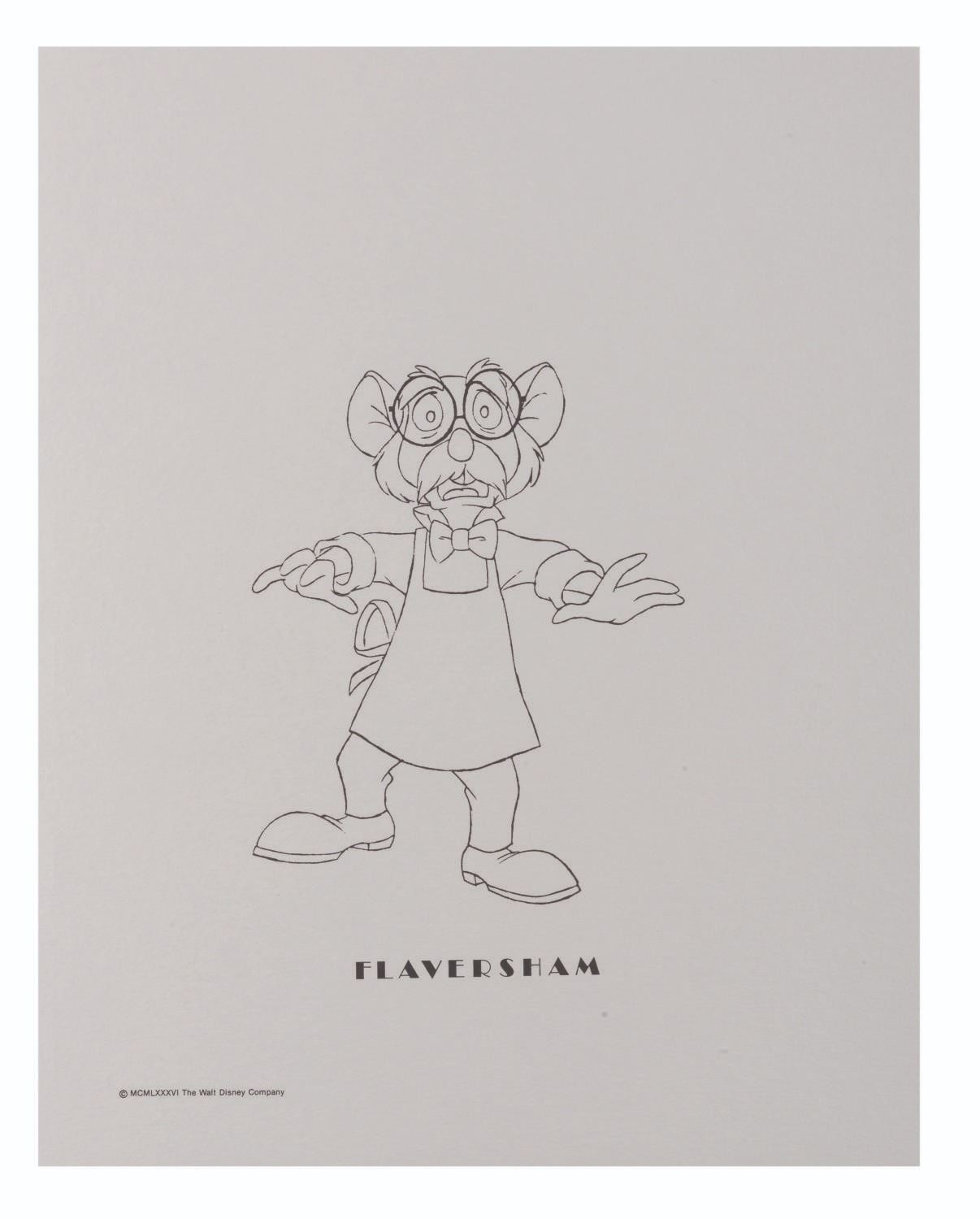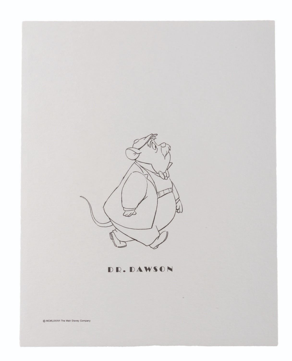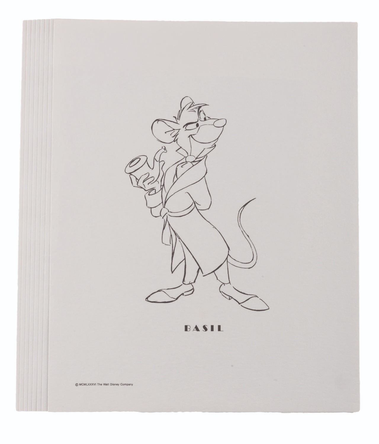 (Disney, 1986) A set of presentation character prints from "The Great Mouse Detective " featuring line art of Basil, Dr. Dawson, Olivia, Flaversham, Ratigan, Bartholomew, Fidget, and Felicia. Each measuring 11 " x 14 ", the prints are in fine condition.