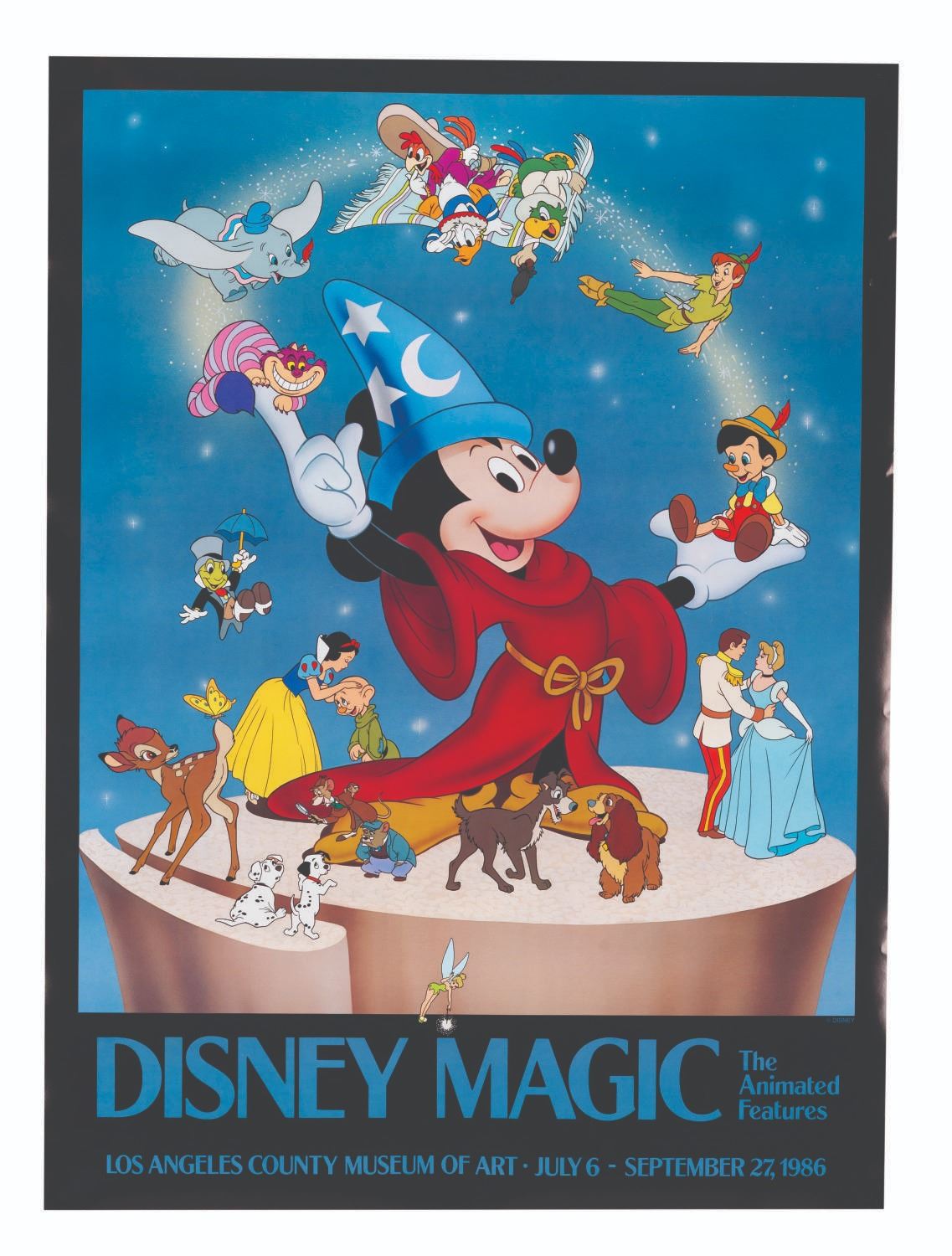 (LACMA, 1986) A souvenir poster from the Los Angeles County Museum exhibit Disney Magic: The Animated Features open from July through September 1986. Measuring 23.5 " x 32 ", the poster is in fine condition with very light creasing.