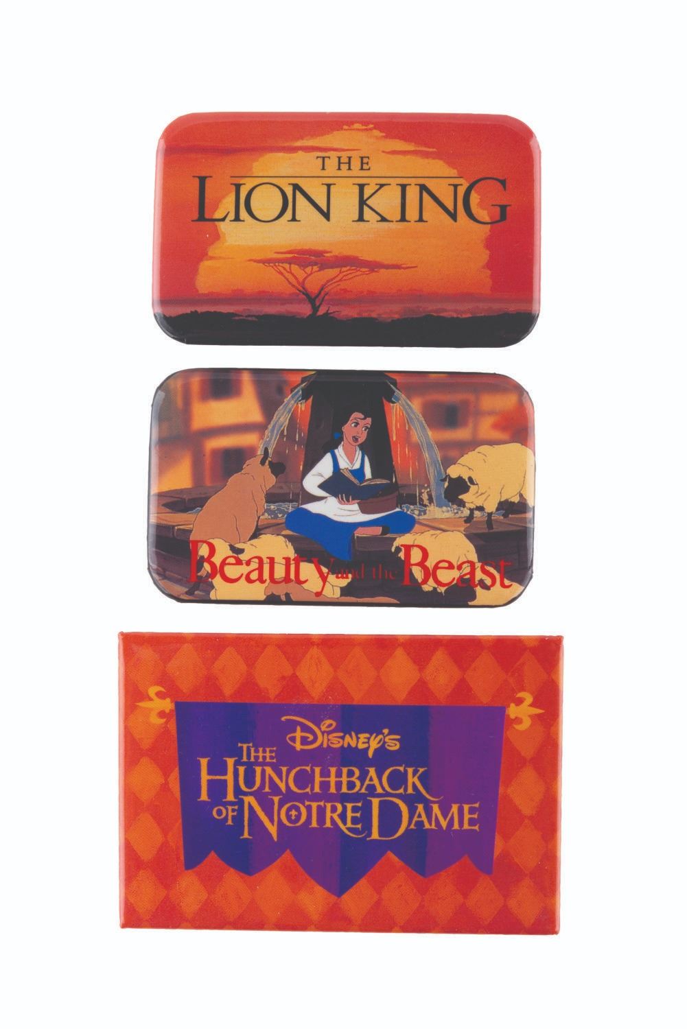 (Disney, 1991-96) Three pinback buttons promoting the releases of "Beauty and the Beast, " "The Lion King, " and "The Hunchback of Notre Dame. " Ranging in size from 1.75 " x 2.75 " to 2.25 " x 3.25 ", the buttons are in good to very good condition with light scratches and oxidation on the reverse from age.