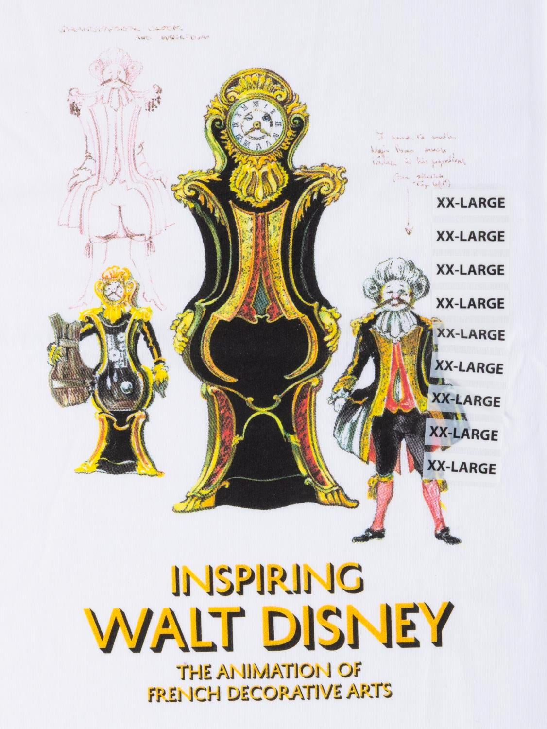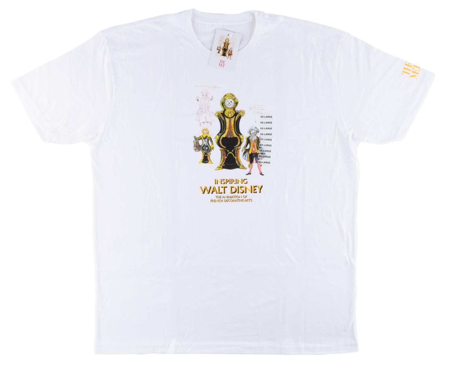 (The Met, 2021) A souvenir "Beauty and the Beast " Cogsworth t-shirt featuring concept art by Peter J. Hall from the Inspiring Walt Disney: The Animation of French Decorative Arts exhibition at the Metropolitan Museum of Art. Labeled size XXL, the t-shirt is in fine-as-new condition in the original bag.
